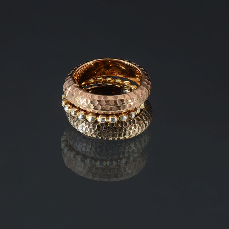 STYLISH 14K STACKING RINGS: Two 14K yellow gold hollow bands and 1 yellow gold twisted band. Weight: 5.8 grams. Size: 7.