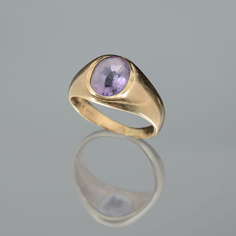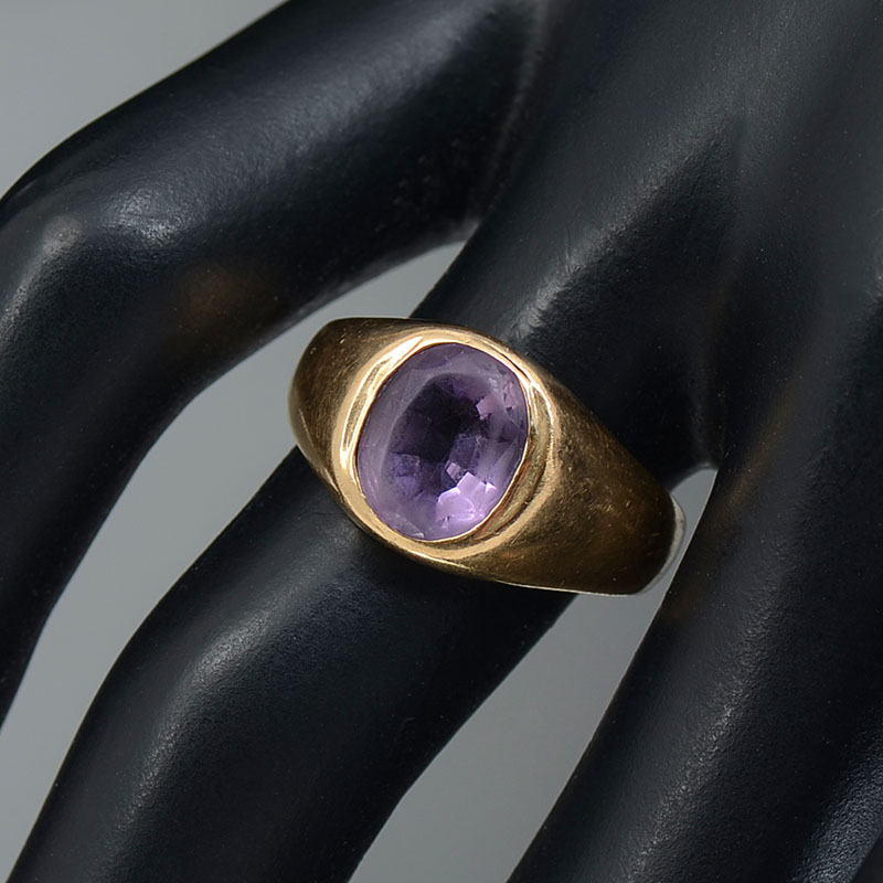 14K AMETHYST RING: 14K yellow gold ring contains one oval mixed cut amethyst. Weight: 2.00 Ct. Approx. The amethyst is gypsy set. Abraded crown. Weight: 4.8 grams. Size: 5.75