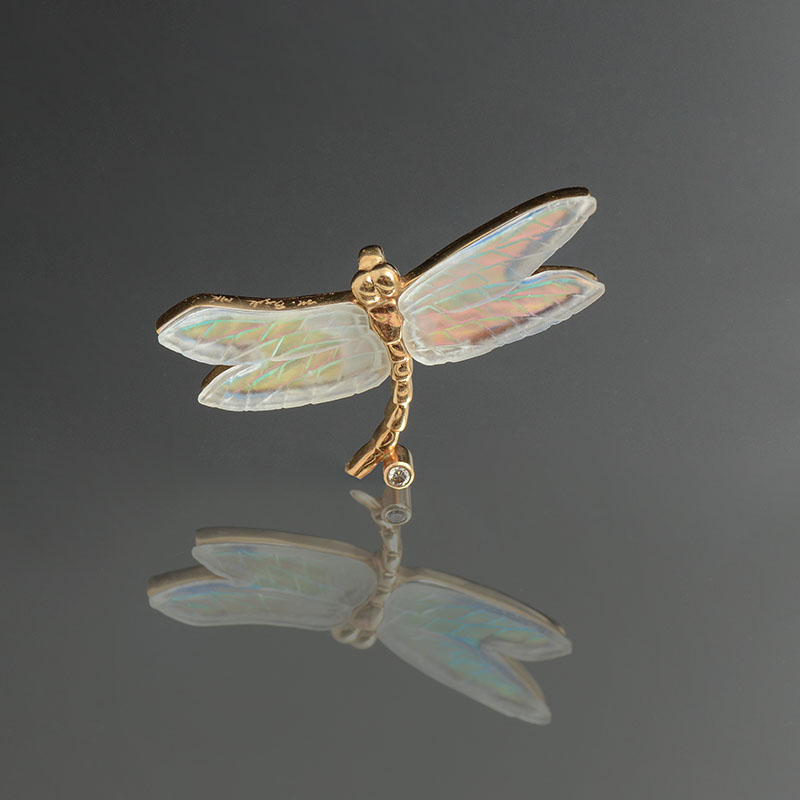 14K CARVED CRYSTAL & DIAMOND DRAGONFLY PENDANT: Charming pendant looks illuminated and is complimented with a bezel set diamond - all set in 14K yellow gold. Total weight 9.5 grams.