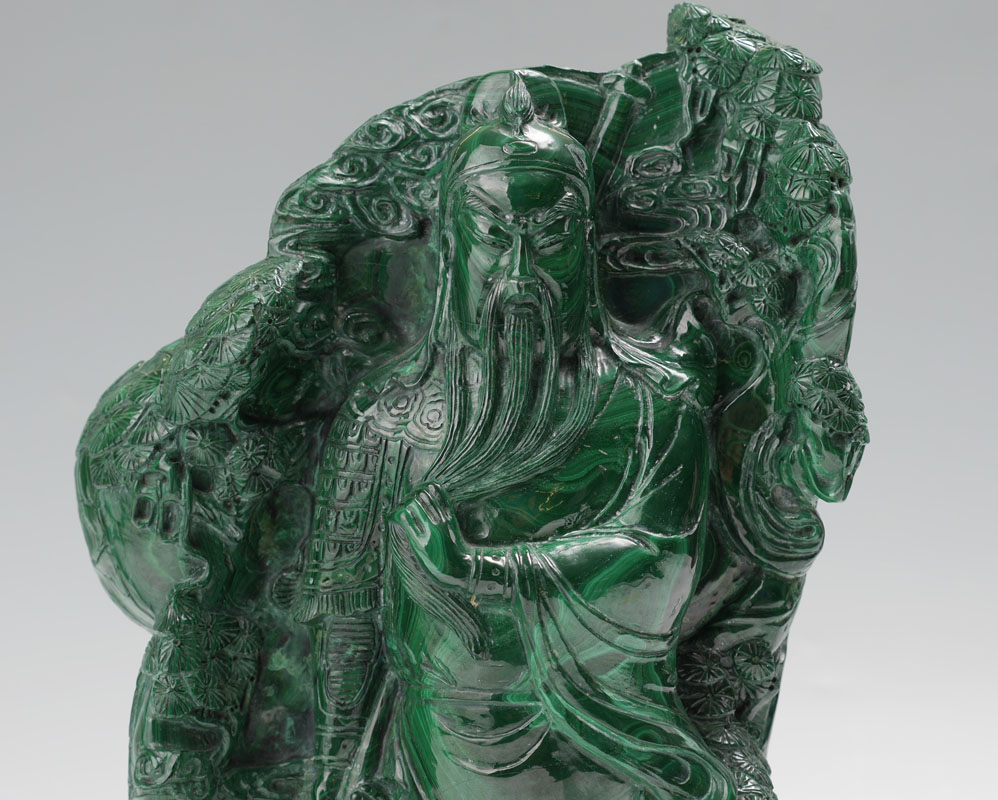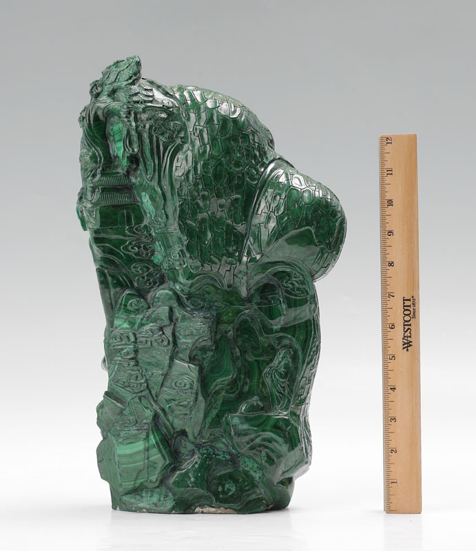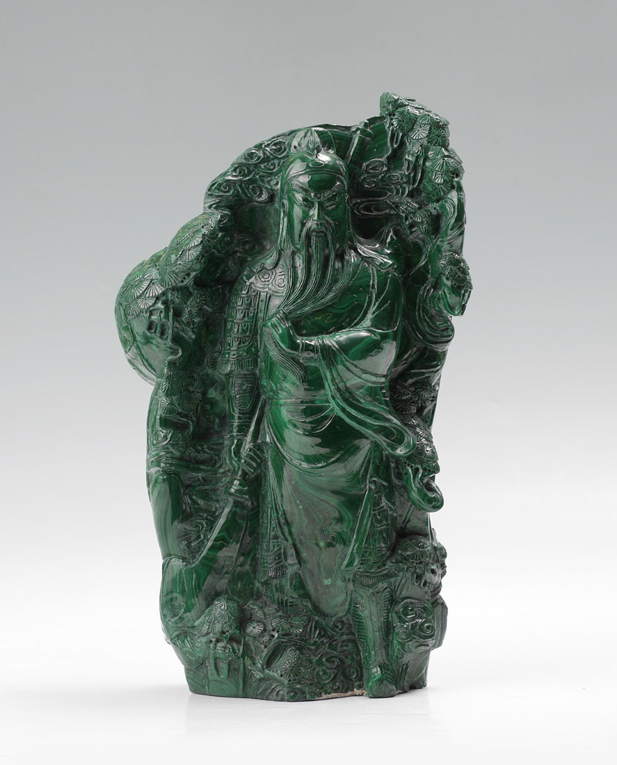 LARGE CHINESE CARVED MALACHITE WARRIOR FIGURE: Relief carved malachite figure of a warrior holding a sword in one hand and his beard in the other, foliate motif background. Overall measures 14 1/2'' h. x 9'' x 4''.