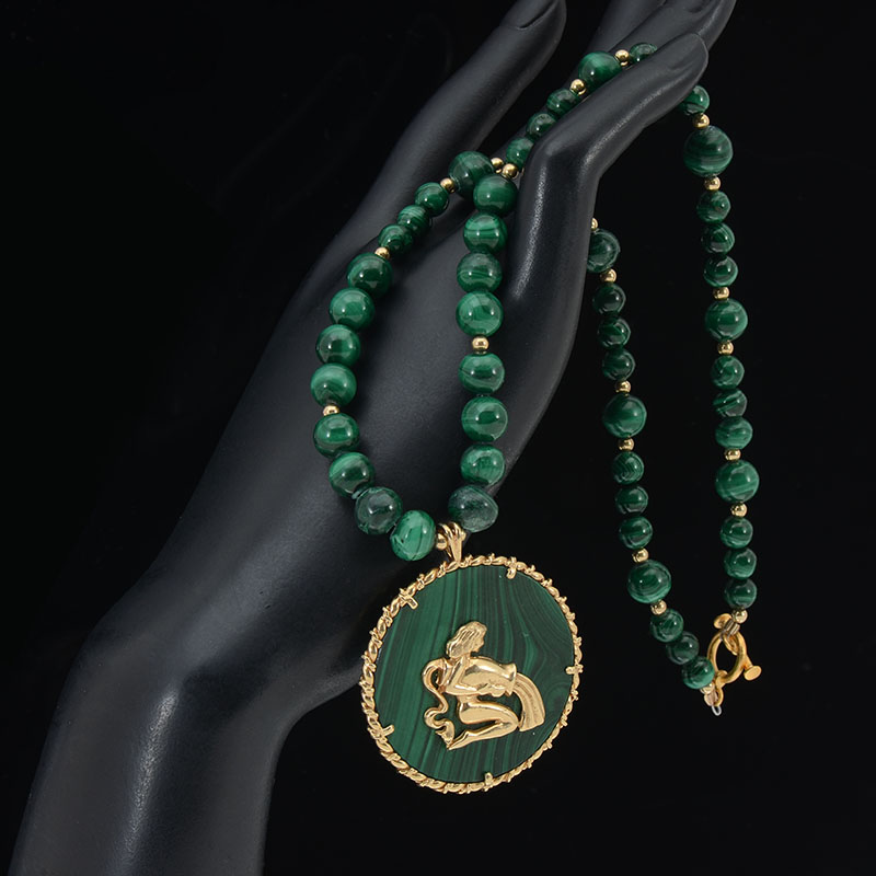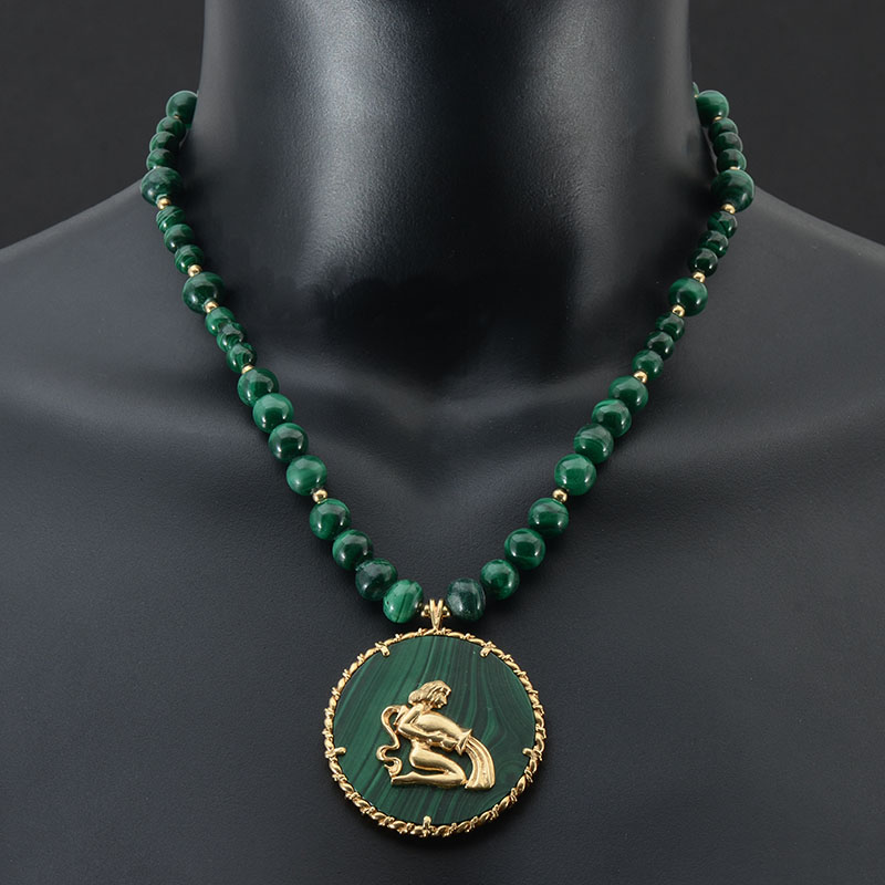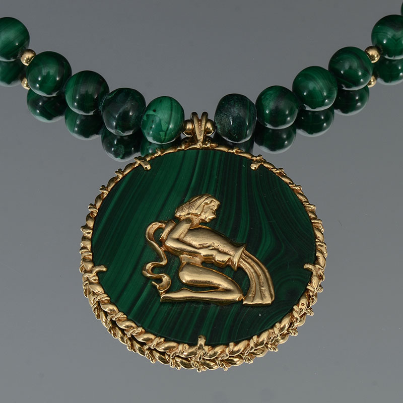 MALACHITE & 14K PENDANT W/ MALACHITE BEAD NECKLACE: Malachite pendant framed in 14K and adorned with gold female form holding a water pitcher. Bale is marked 14K. 18'' malachite bead necklace with gold separator beads.