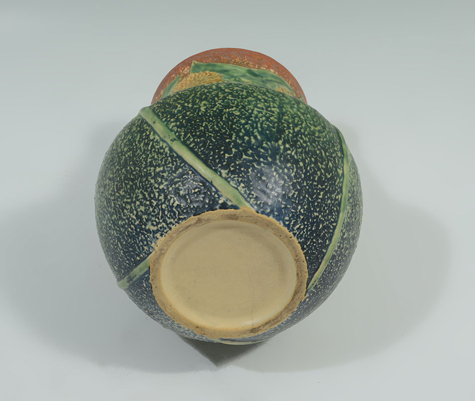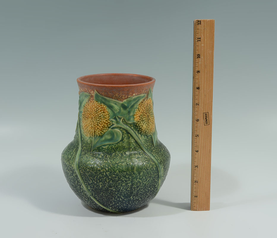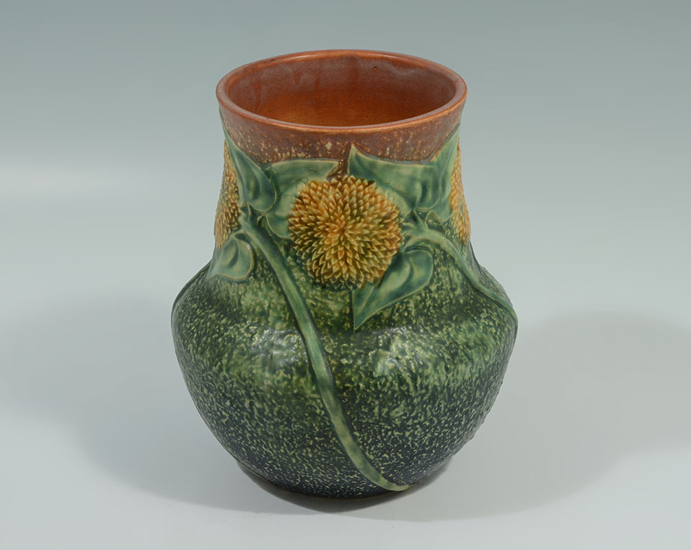 ROSEVILLE POTTERY SUNFLOWER VASE: Unmarked Roseville vase in the Sunflower pattern. Measures 8 1/4'' h. x 7 1/4'' dia.