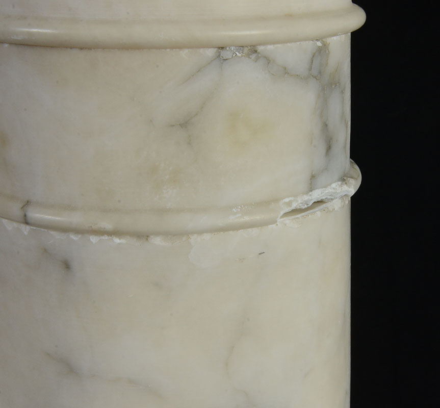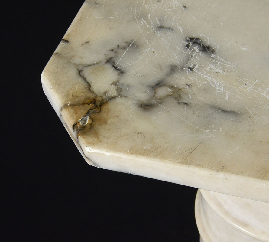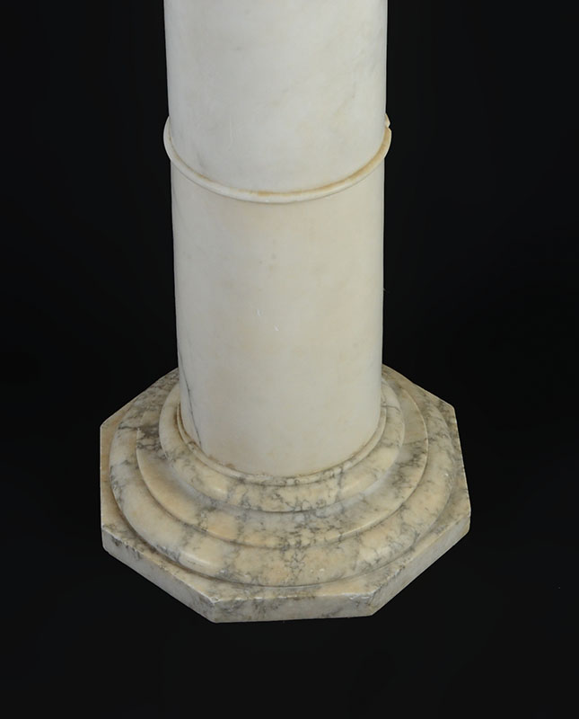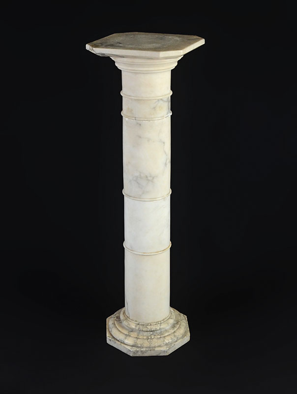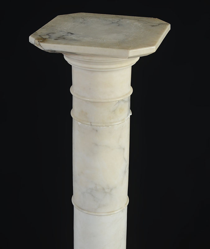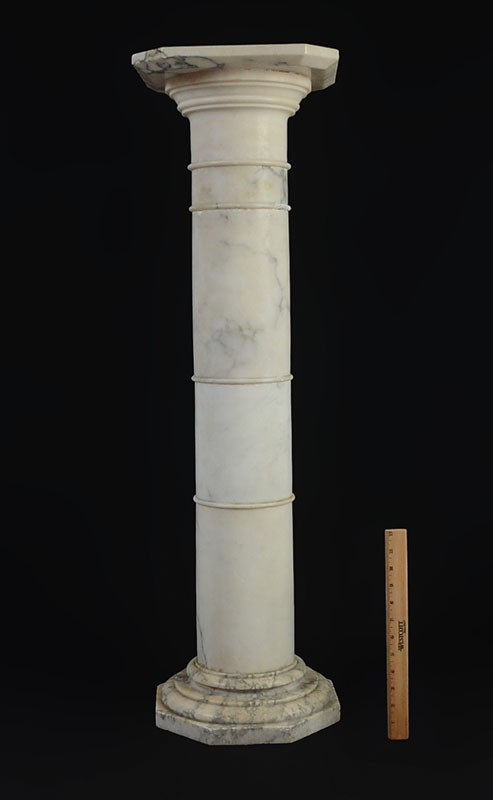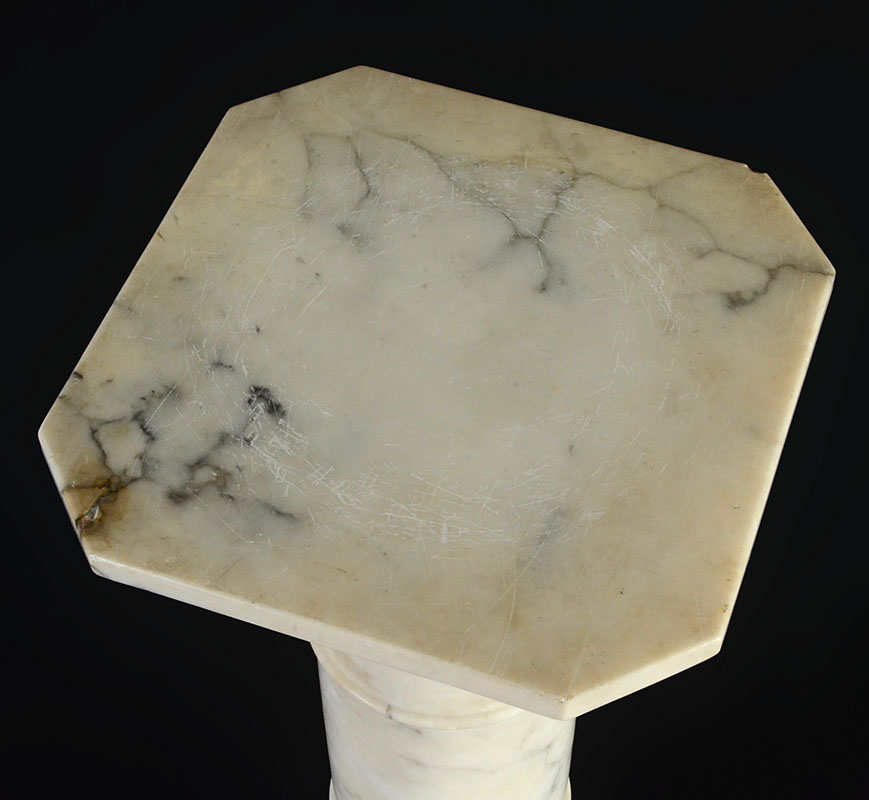 WHITE MARBLE PEDESTAL: Separates into 3 sections, overall measures 39 3/4'' h., top 11 1/2'' x 11 1/2''.