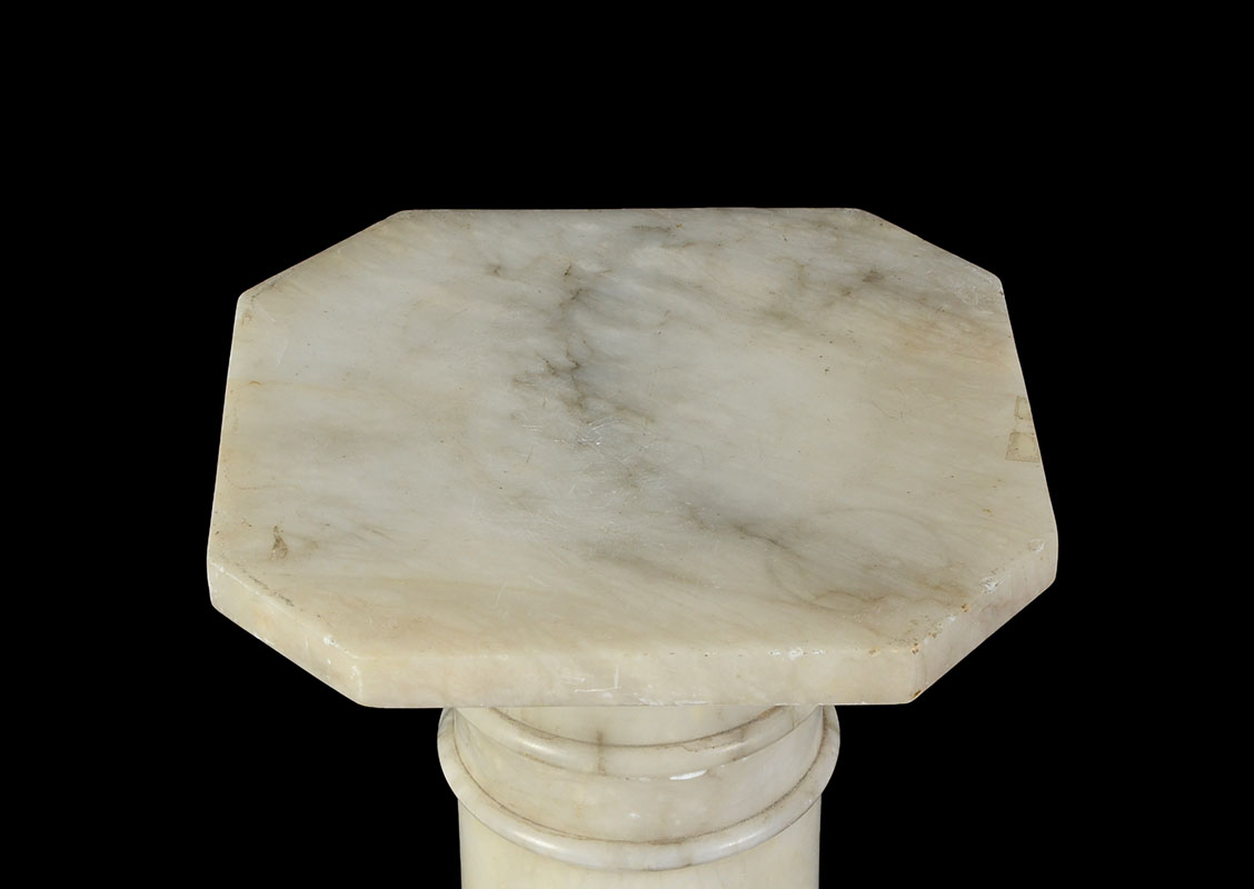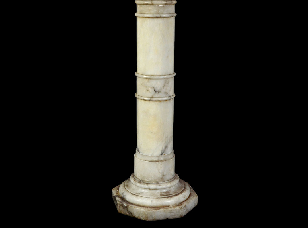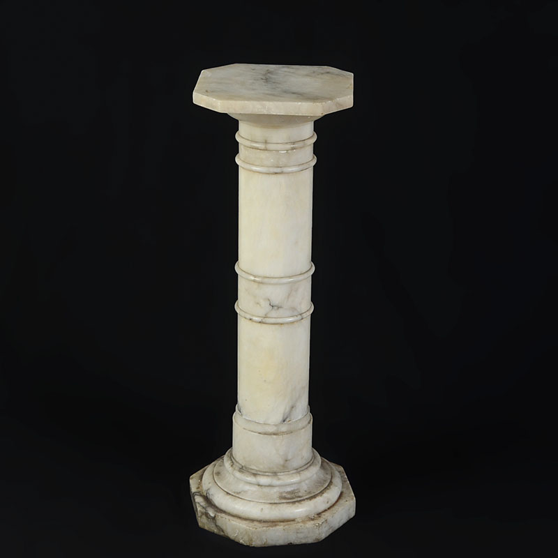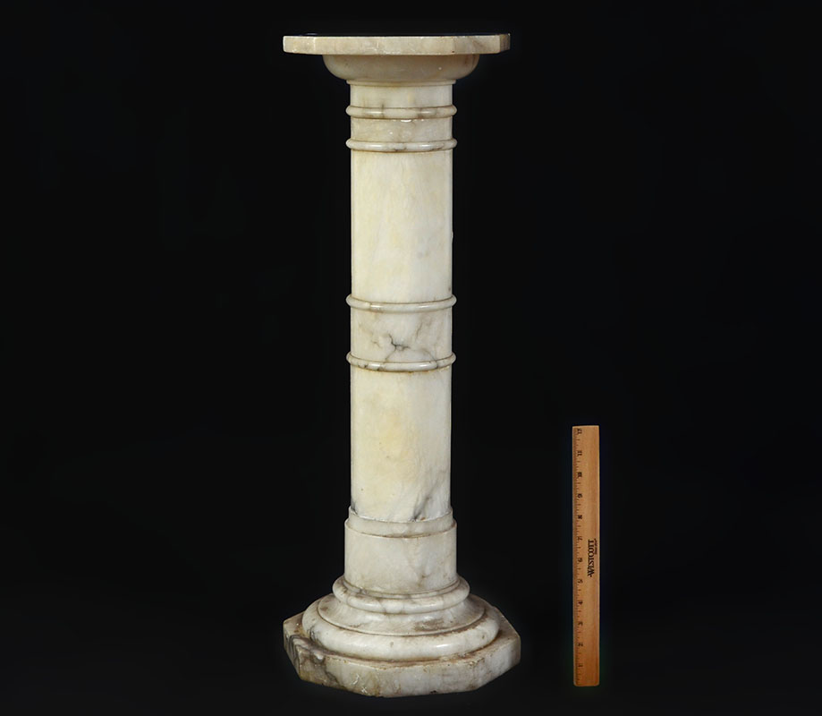 MARBLE PEDESTAL / STAND: Variegated white marble, top removes, overall 29 1/2'' h. x 11'', top 9 1/2'' x 9 1/2''.