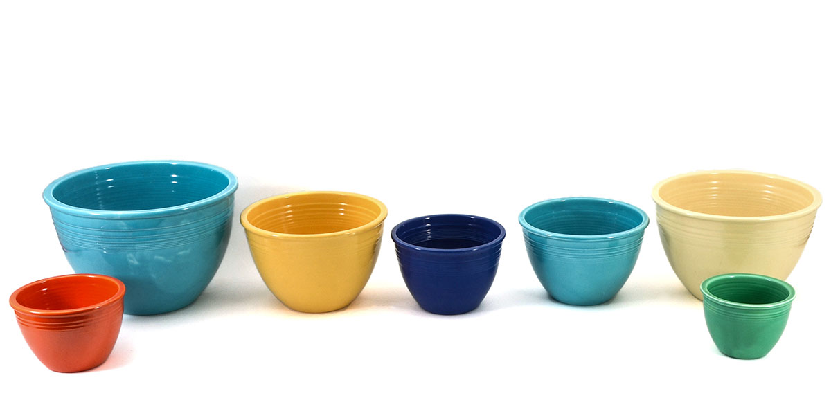 VINTAGE FIESTA WARE 7 NESTING BOWLS SET: Set of 7 graduated bowls, largest turquoise 7 1/4'' h. x 11 1/8'', smallest green 3 1/2'' h. x 5''.
