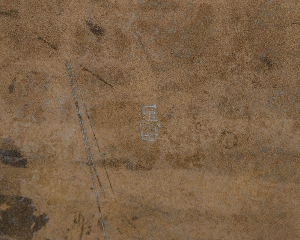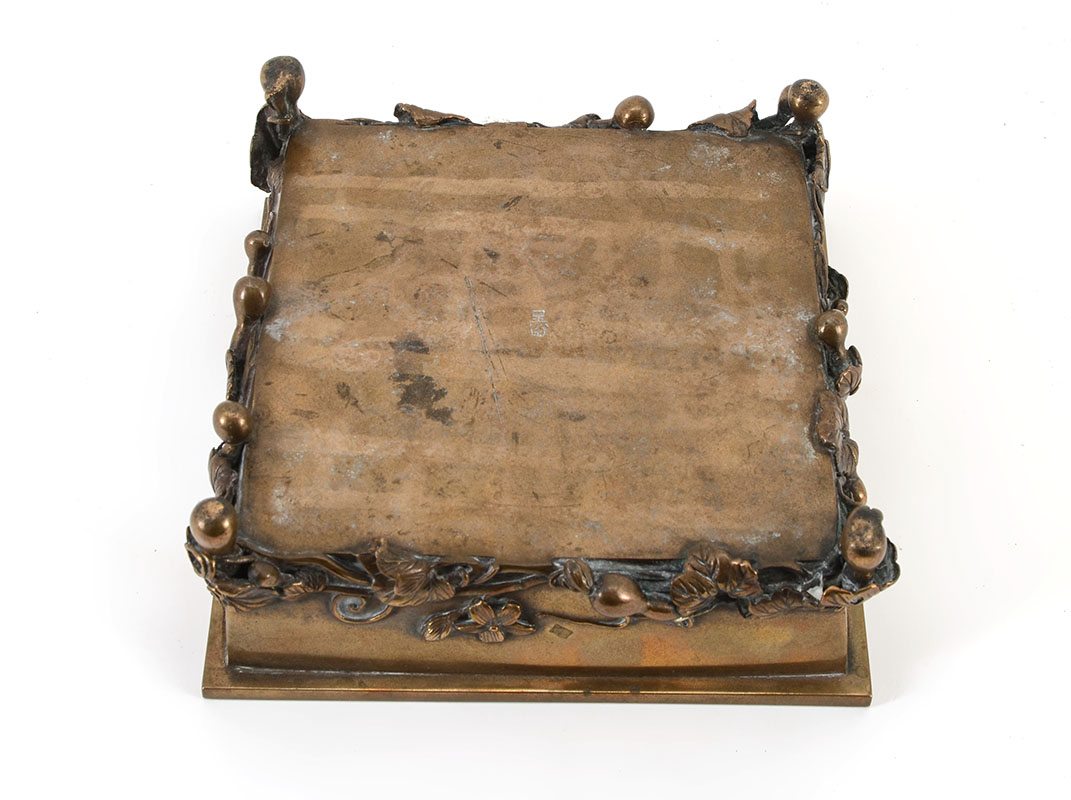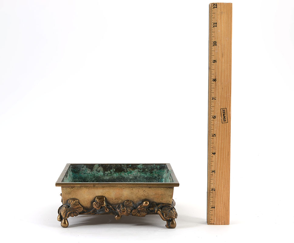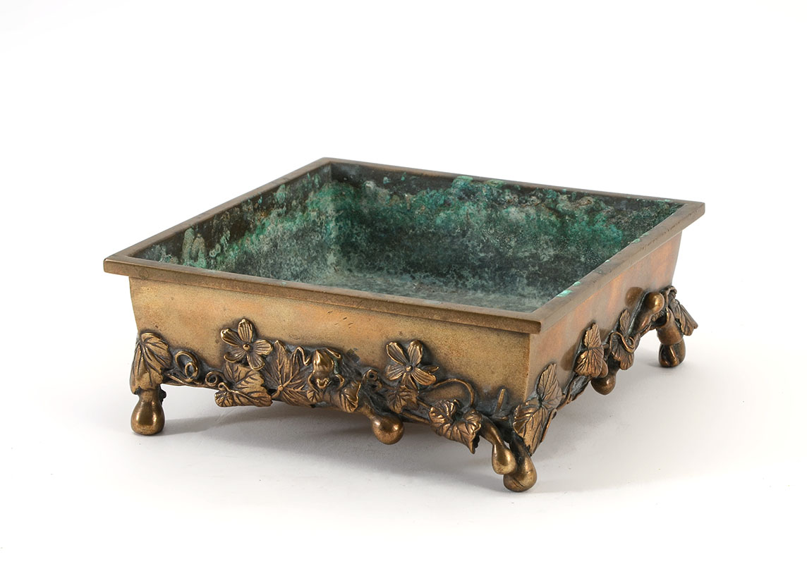JAPANESE BRONZE BONSAI TREE PLANTER: Square planter with gourd vine motif skirt, on 4 feet, signed on base. Most likely Meiji period, measures 2 1/2'' h. x 6 1/2'' x 6 1/2''.