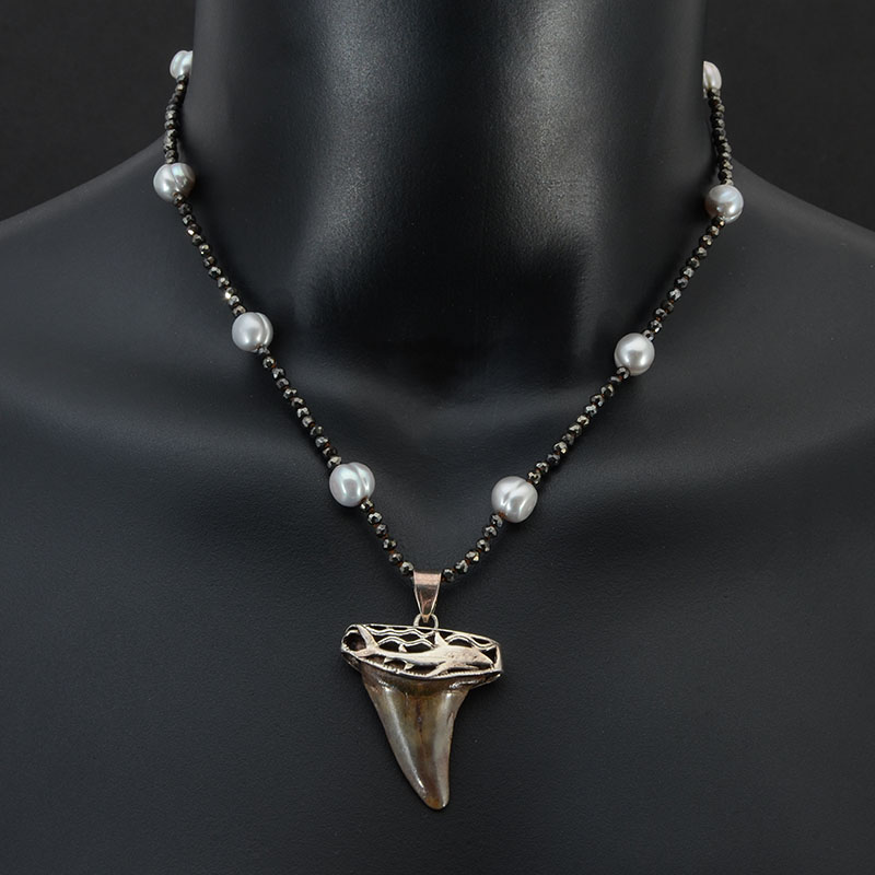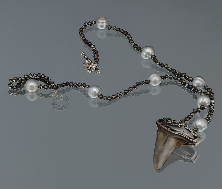SHARK TOOTH CAPPED IN STERLING WITH PYRITE & PEARL: 16'' necklace in pyrite and pearls is the perfect way to display this sterling capped shark's tooth.