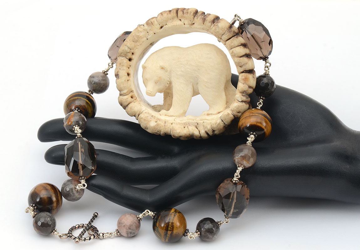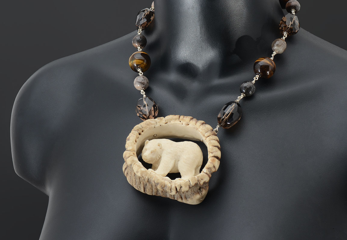 DETAILED ELKHORN CARVING OF BEAR ON NECKLACE: Smoky topaz, tiger eye, and jasper necklace are perfect compliments to this beautiful carving. Carving measures approx 3'' x 2.5''. Total weight 186.5 grams.
