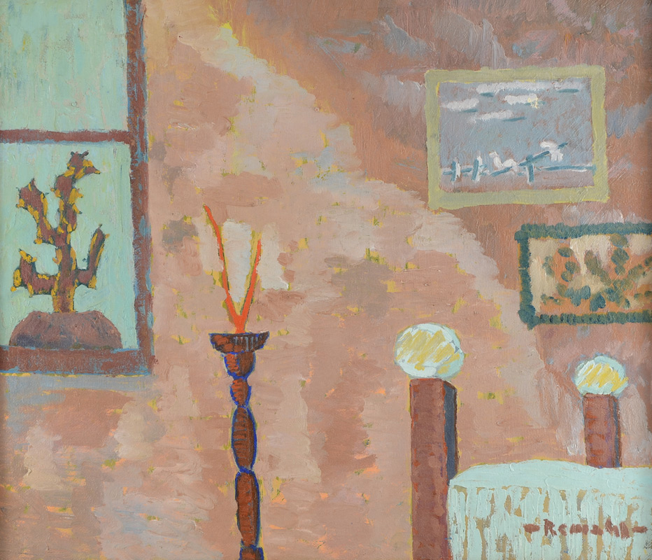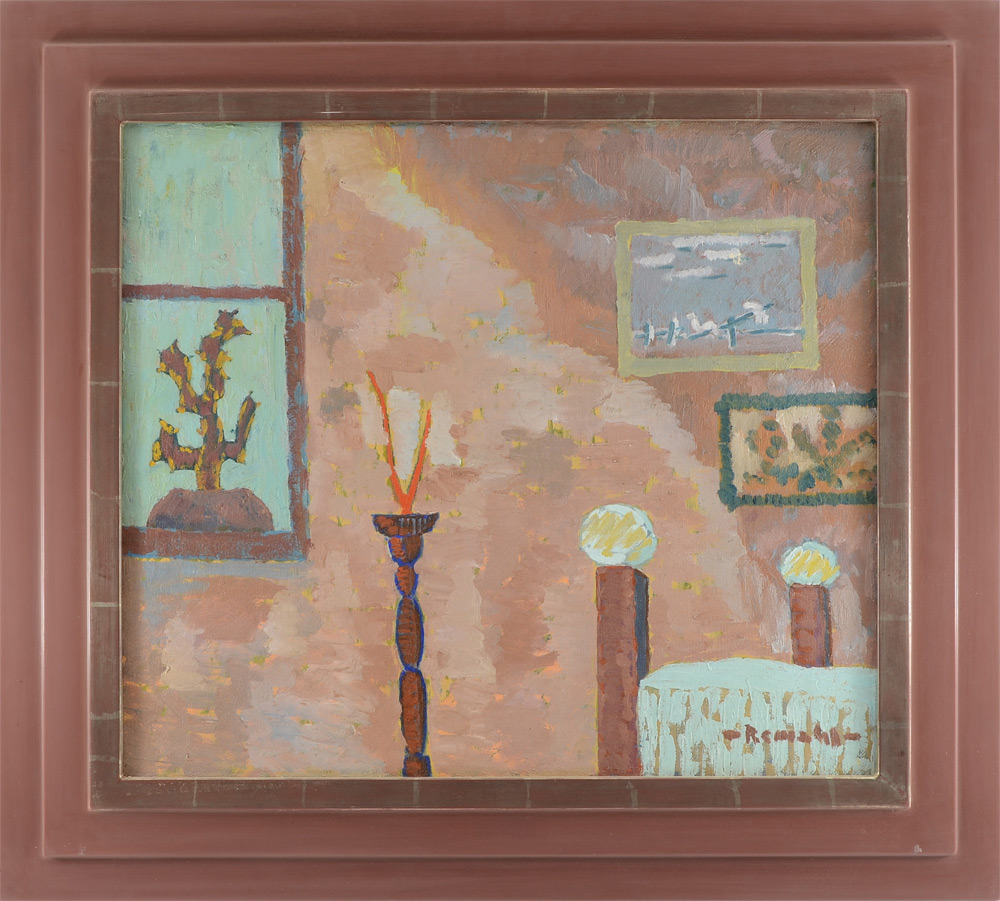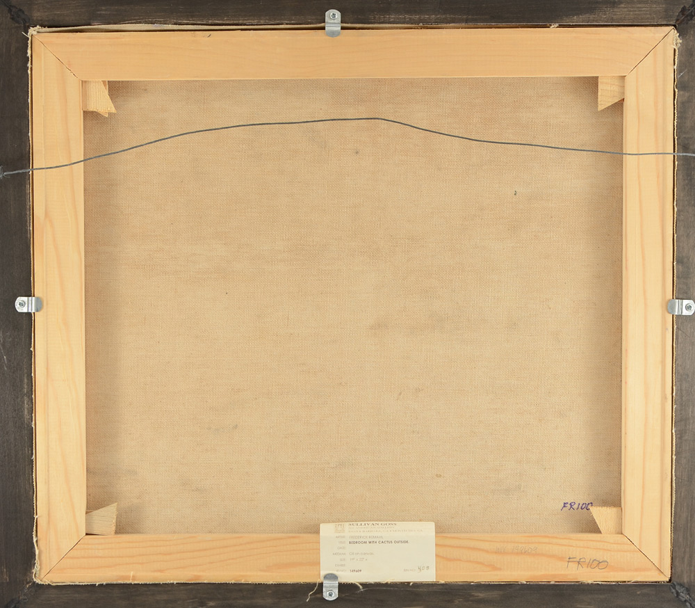 REMAHL, Frederick, (Swedish, 1901-1968): ''Bedroom with Cactus Outside'', Oil/Canvas, 19'' x 22'', signed lower right, Sullivan Goss Gallery label affixed verso, custom painted frame, 26.25'' x 29''.
