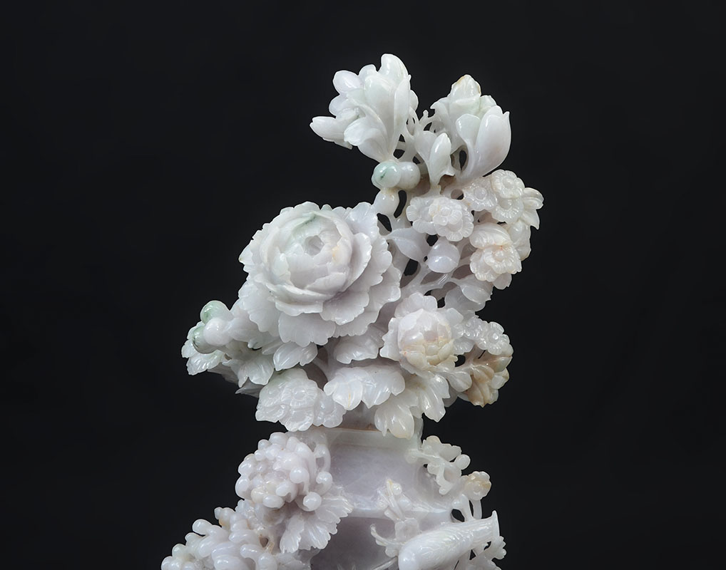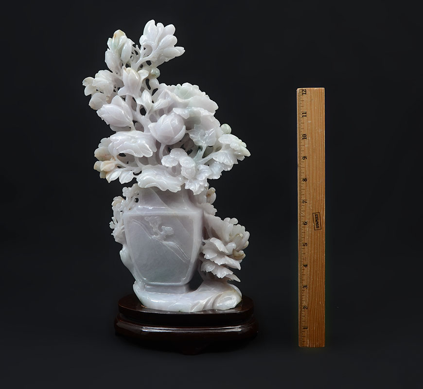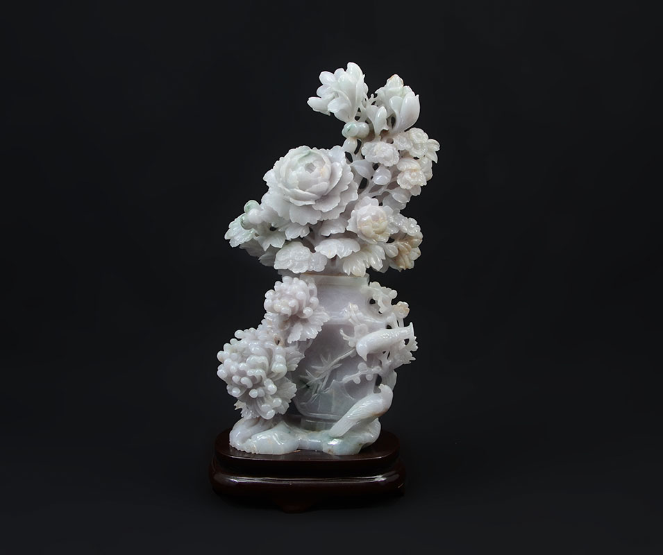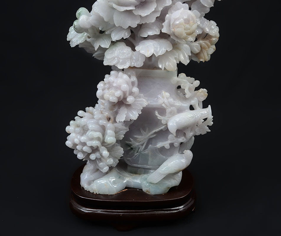 CHINESE CARVED JADEITE FLOWER VASE AND BIRDS: Apple green and lavender jadeite or similar stone figures of flowers in a vase with 2 birds. Measures 13 3/4'' h. x 7'' x 3 1/4''. Sold with wood stand 1 3/4'' h. x 7 1/4'' x 4 1/2''.