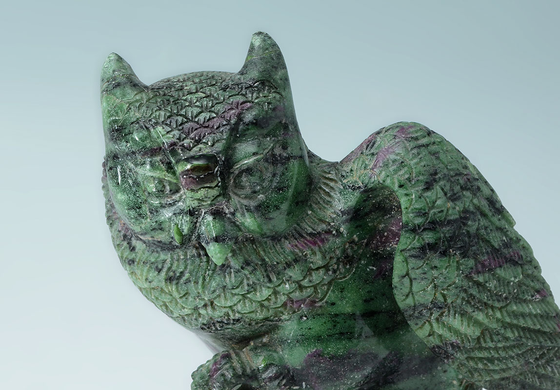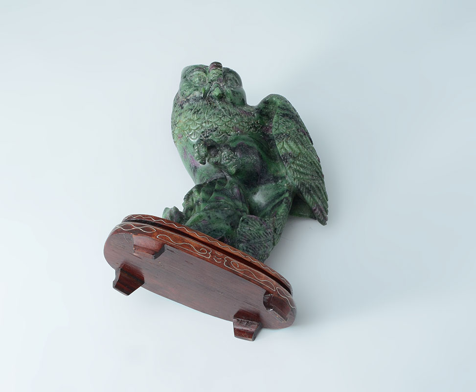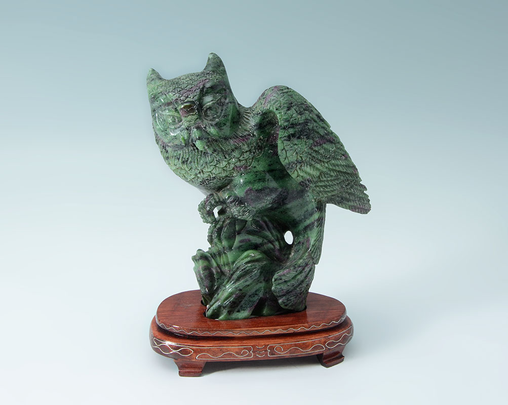 CARVED JASPER FIGURAL OWL: Striated green and purple jasper or similar stone figure of an owl on one foot, affixed to wood stand with silver wire inlay. Overall measures 7 3/4'' h. x 5 1/4'' x 3 1/4''.