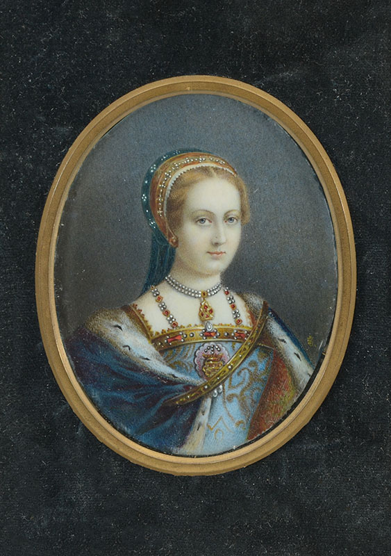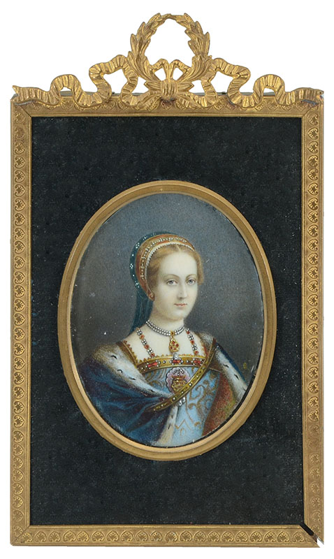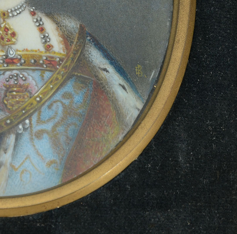 MINIATURE PAINTING OF A ROYAL FEMALE: 19th C. Oval, 3.25'' x 2.5'', monogramed lower right EB, gilt metal frame, 7'' x 4''.