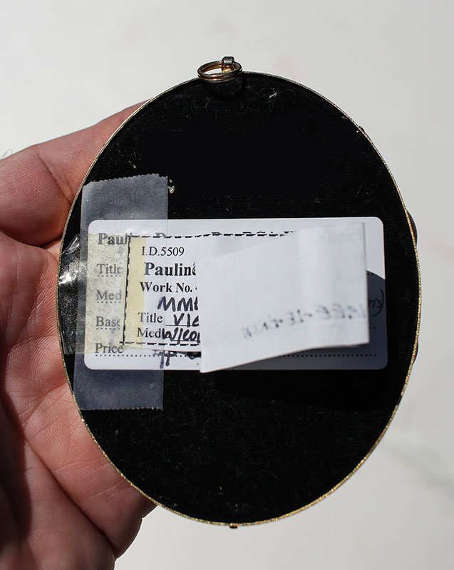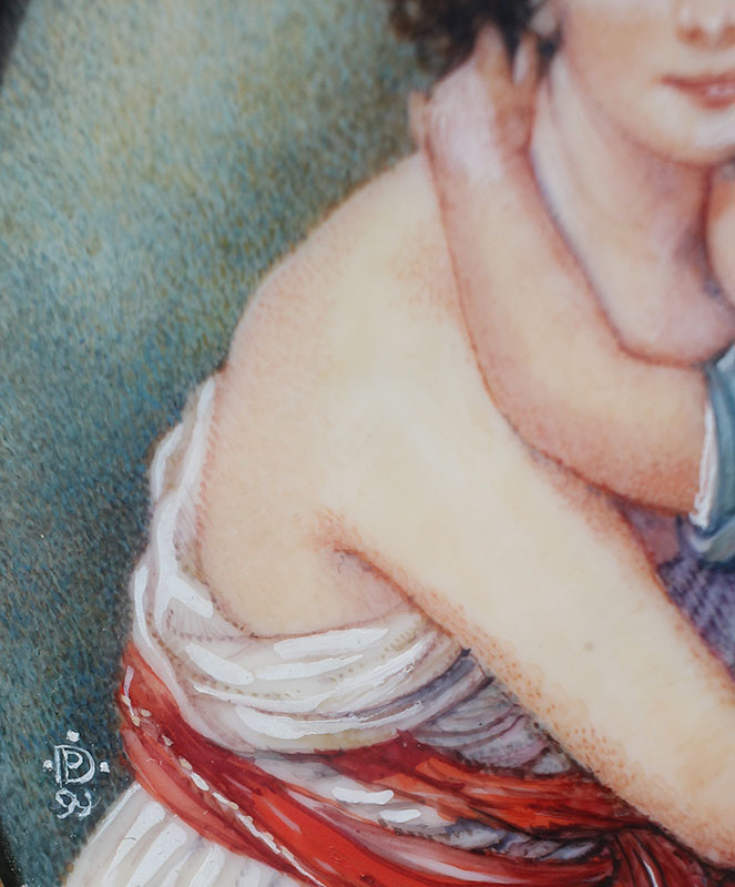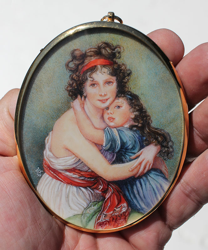DENYER, Pauline, (American, 20th Century): ''Vigee Le Brun & her Daughter'', Watercolor, Oval, size 3.5'' x 2.75'', monogrammed lower let, two exhibition labels affixed verso, Oval frame overall measurements 4'' x 3''.