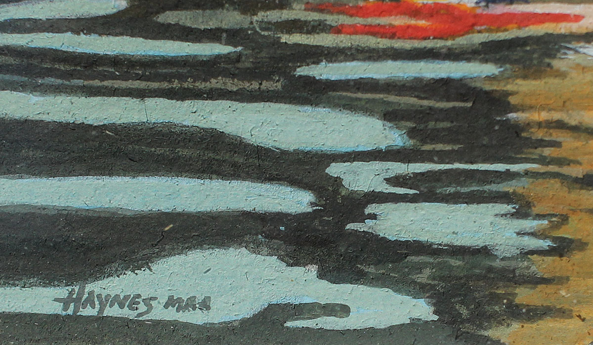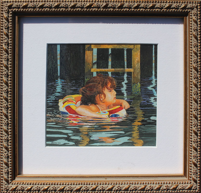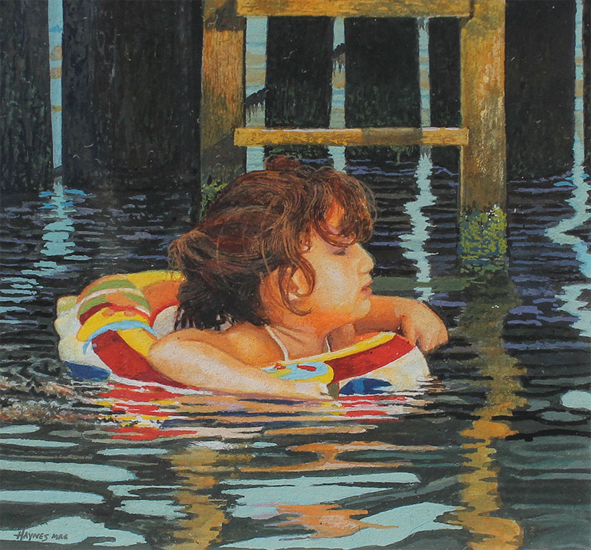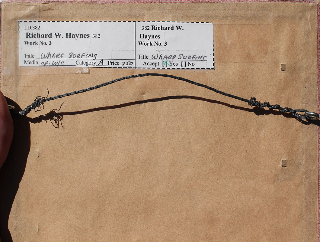 HAINES, Richard, (American, 1906-1984): ''Wharf Surfing'', Opaque Watercolor, sight size 3.25'' x 3.5'', signed lower left, exhibition label verso, framed, 6'' x 6.25''. Richard Haines is known for his watercolor paintings.