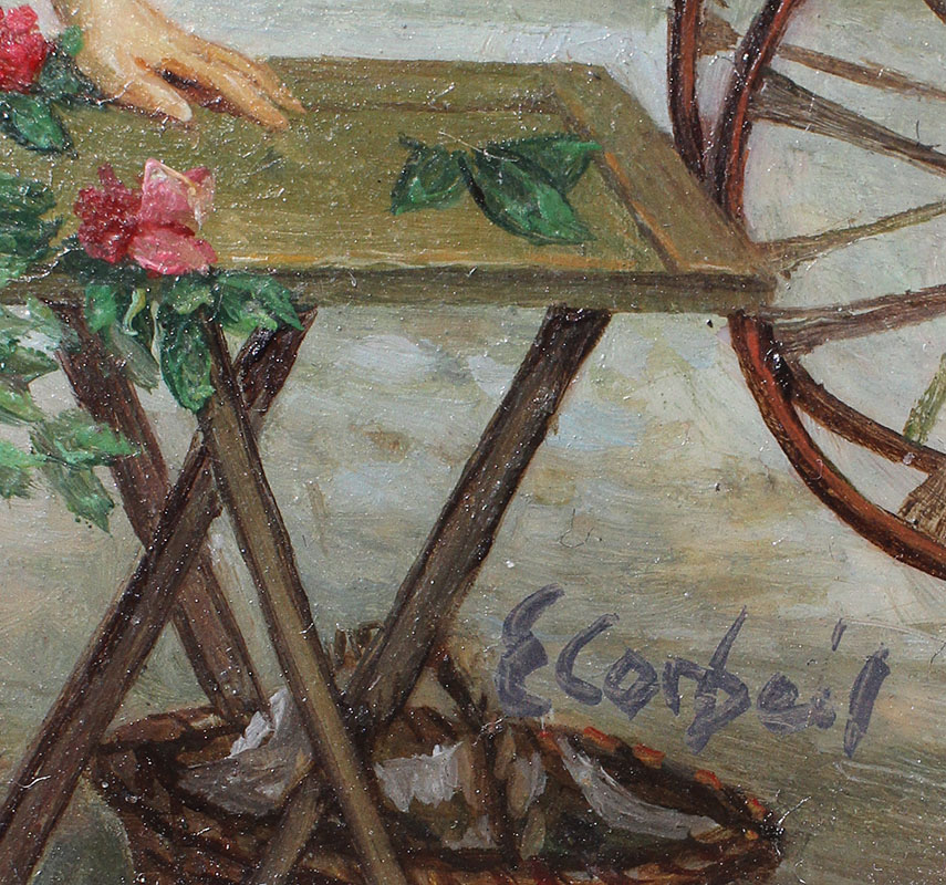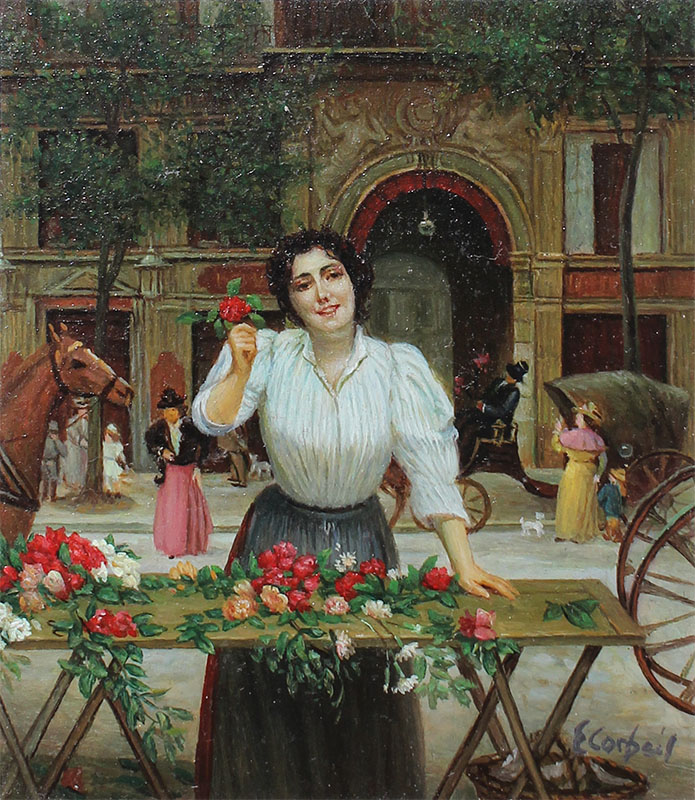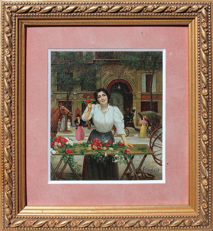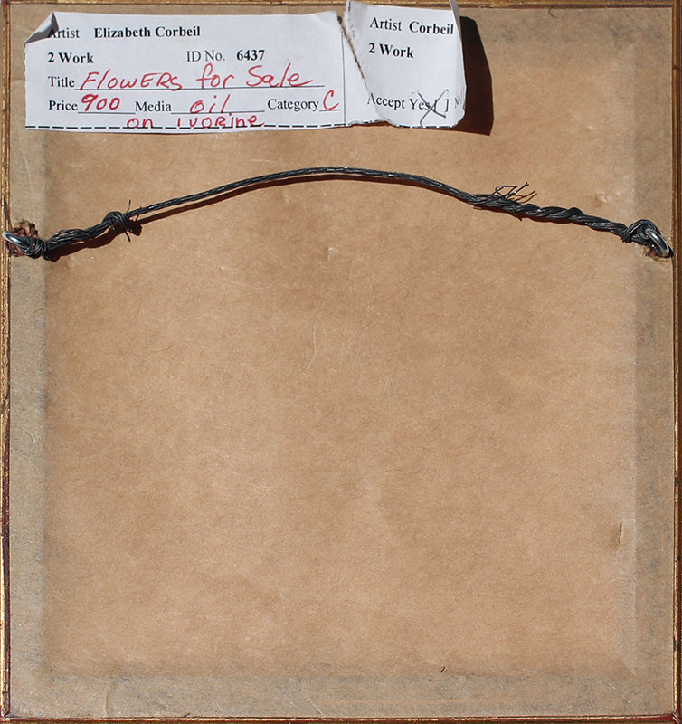 CORBELL, Elizabeth, (American, 1881-1954): ''Flowers for Sale'', Oil/Ivorine, sight size 3.25'' x 2.75'' signed lower right, exhibition label affixed verso, framed, 5.75'' x 5.25''. Elizabeth Corbell is known for her miniature paintings.