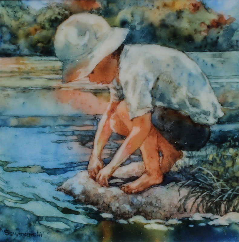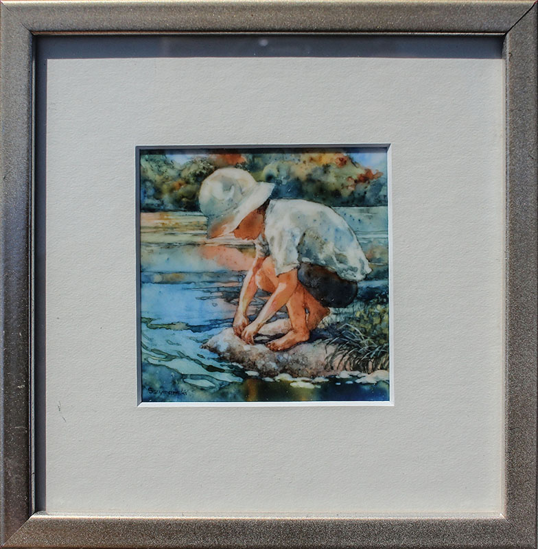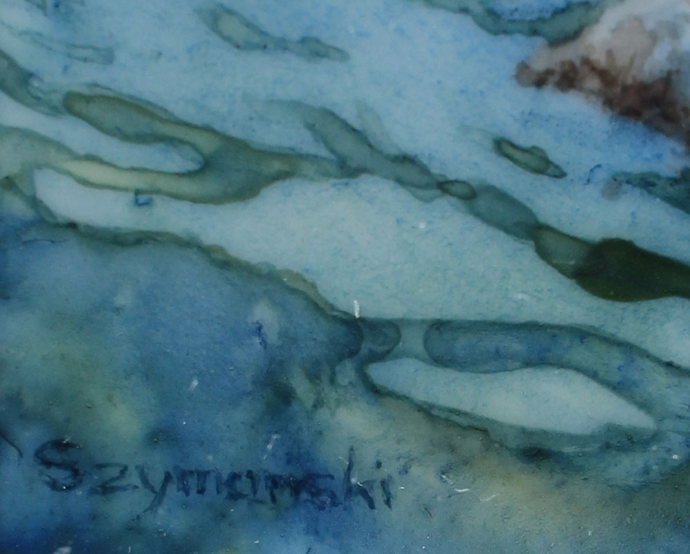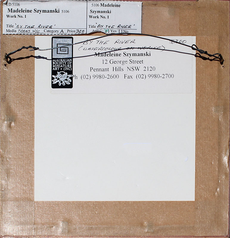 SZYMANSKI, Madeleine, (American,. 20th Century): ''By the River'', Watercolor, sight size 3'' x 2.75'' signed lower left, exhibition label affixed verso, framed, 6.25'' x 6.25''.