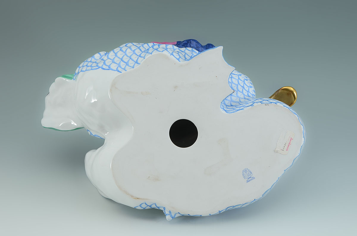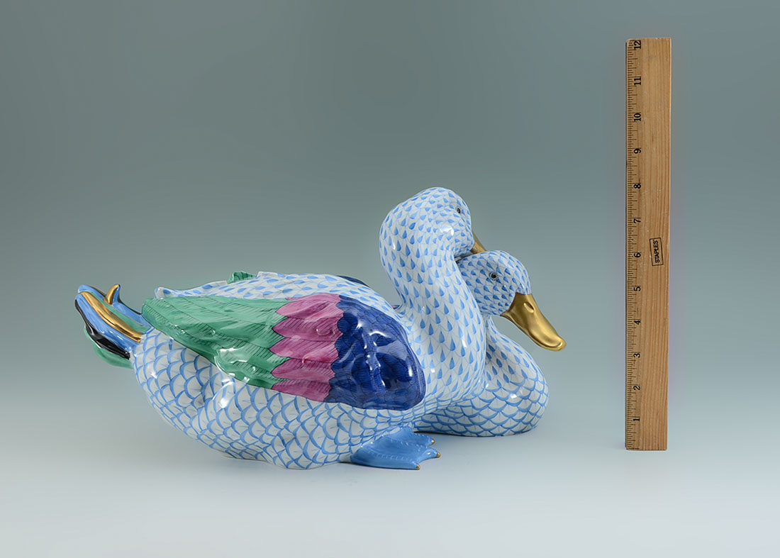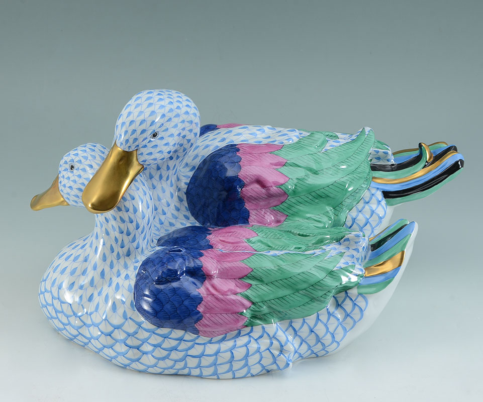 LARGE BLUE HEREND FISHNET DUCKS FIGURAL GROUP: Porcelain figural group of 2 ducks, blue fishnet design, polychrome wings, marked Herend, incised 5035 over 10, measures 7 1/2'' h. x 15 1/4'' x 9 3/4''.