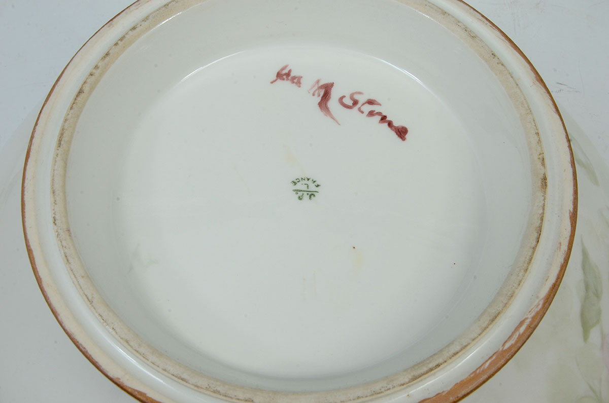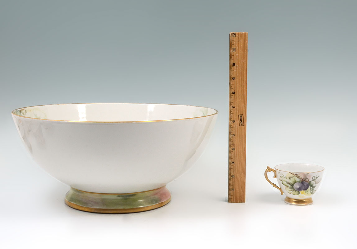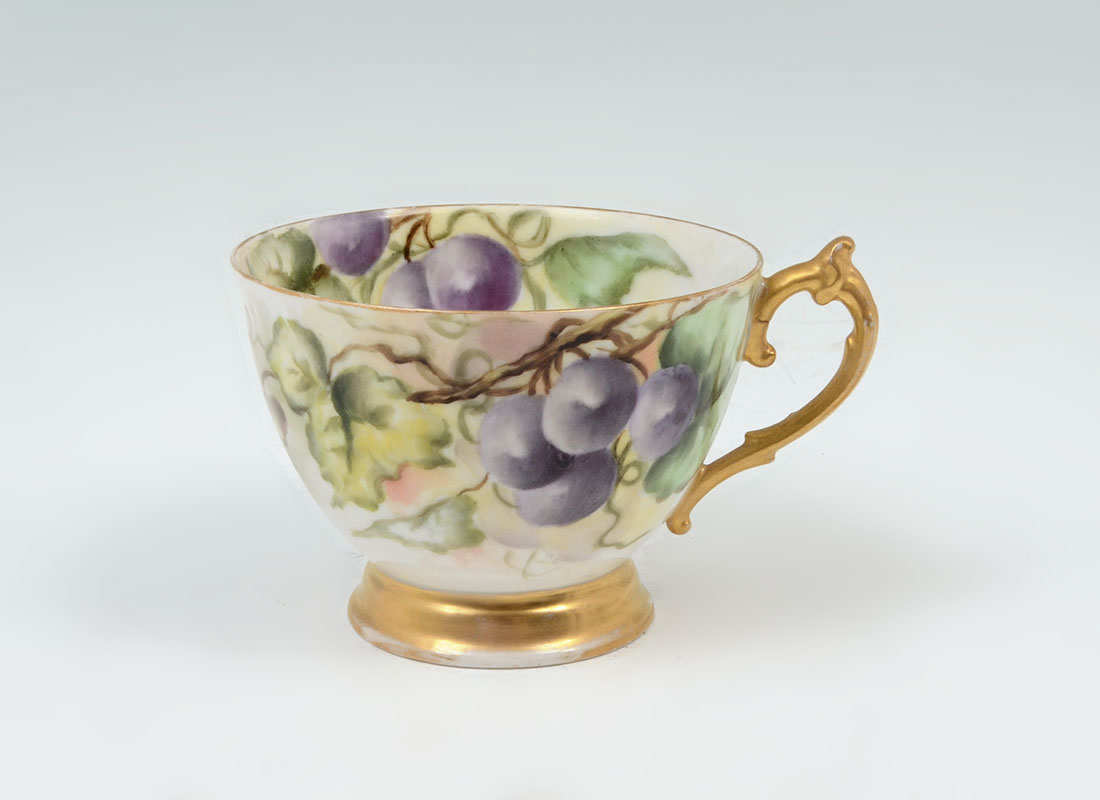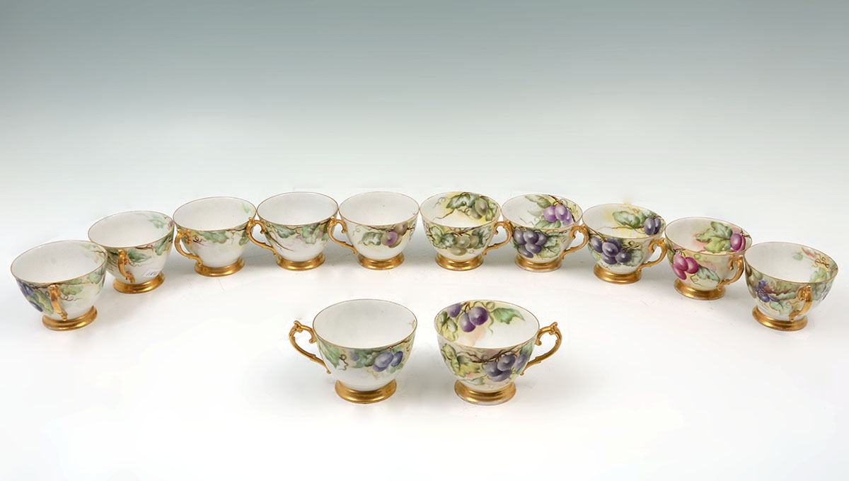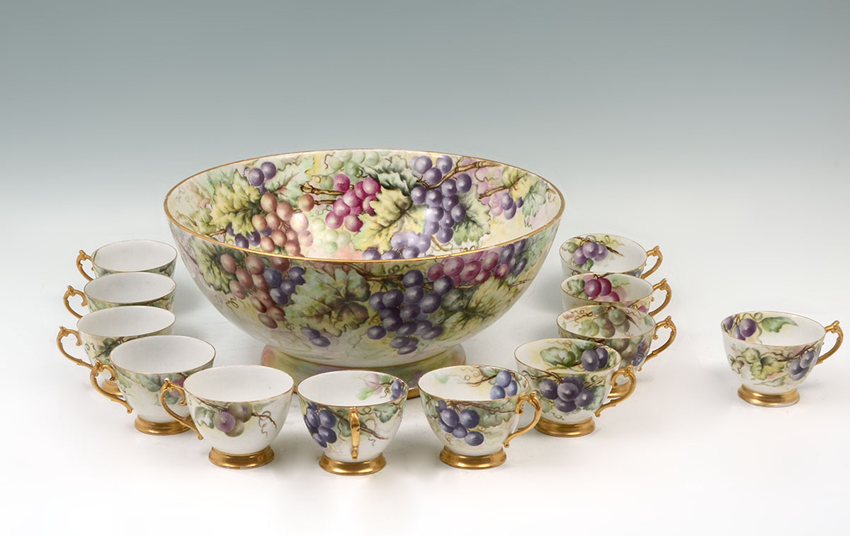 GRAPE VINE PAINTED LIMOGES PUNCH BOWL AND CUPS: 13 pieces total, each hand painted by Ida M. Stone, to include 1) Jean Pouyat punch bowl, 6 1/2'' h. x 14 3/4'' dia. 2-13) 12 Tressemann & Vogt handled cups, 2 1/2'' h.