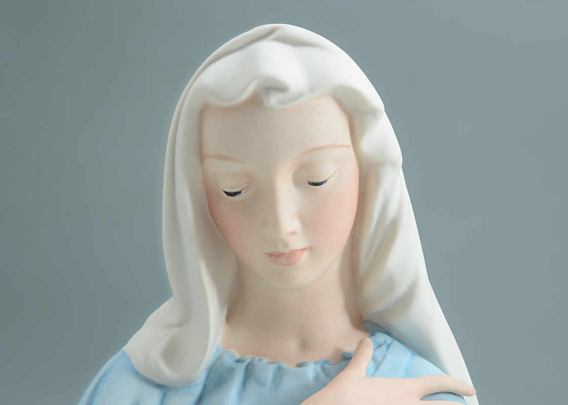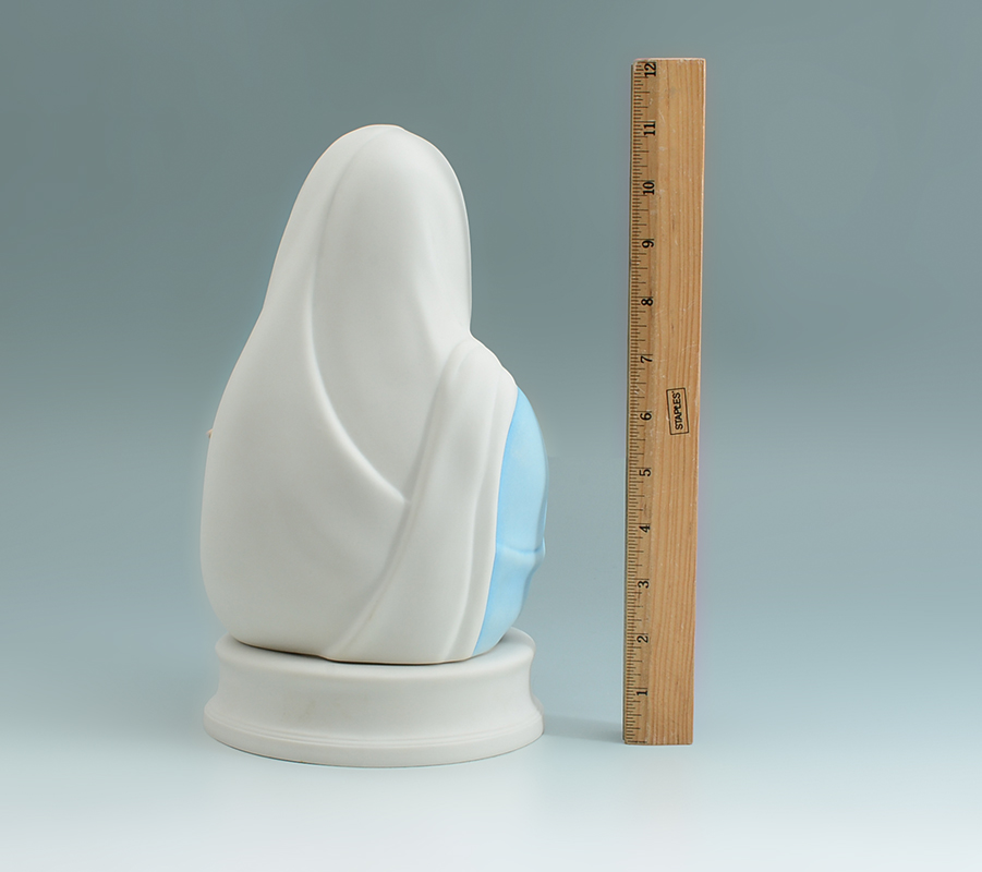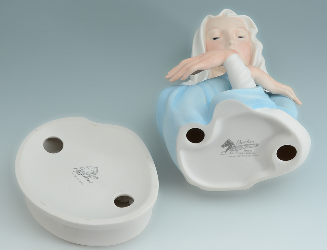 BOEHM PORCELAIN 605D LA PIETA MADONNA FIGURE: Marked on base with black Boehm mark, 9'' h. x 6'' x 5'', sold with a fitted porcelain stand. 1 3/4'' h.