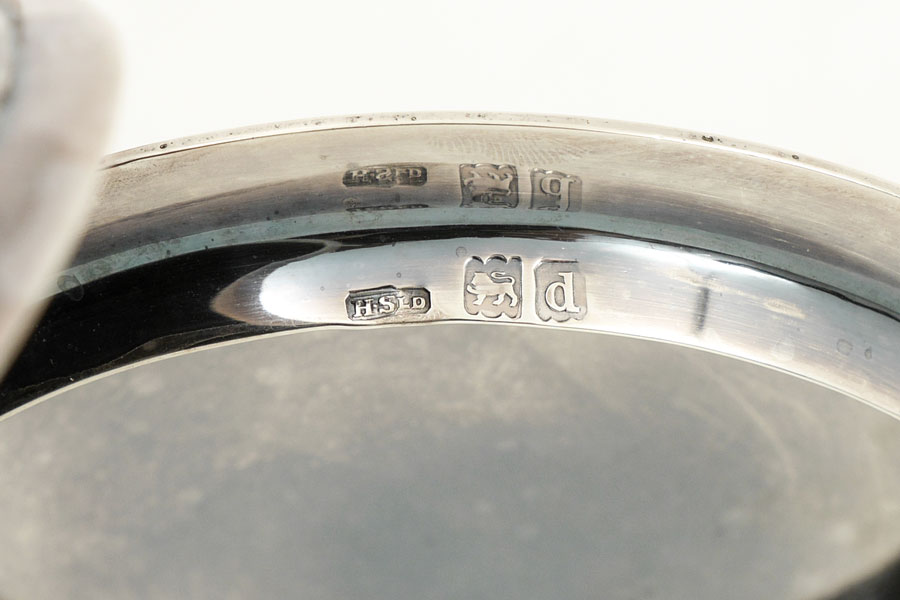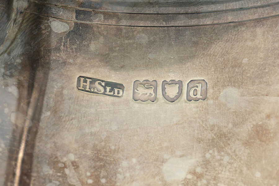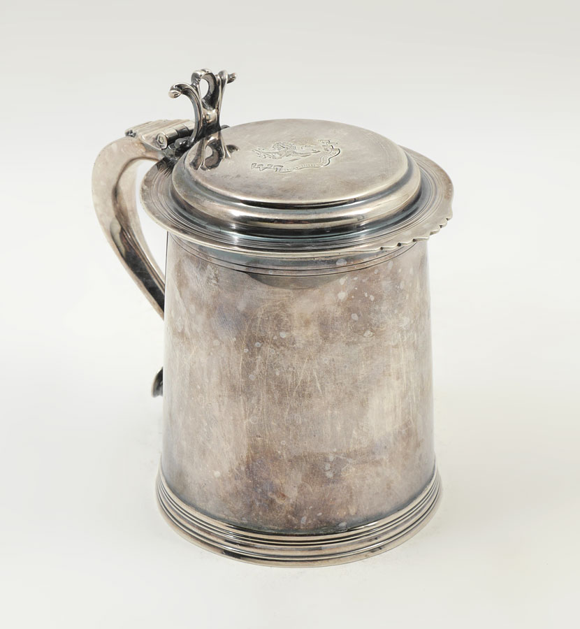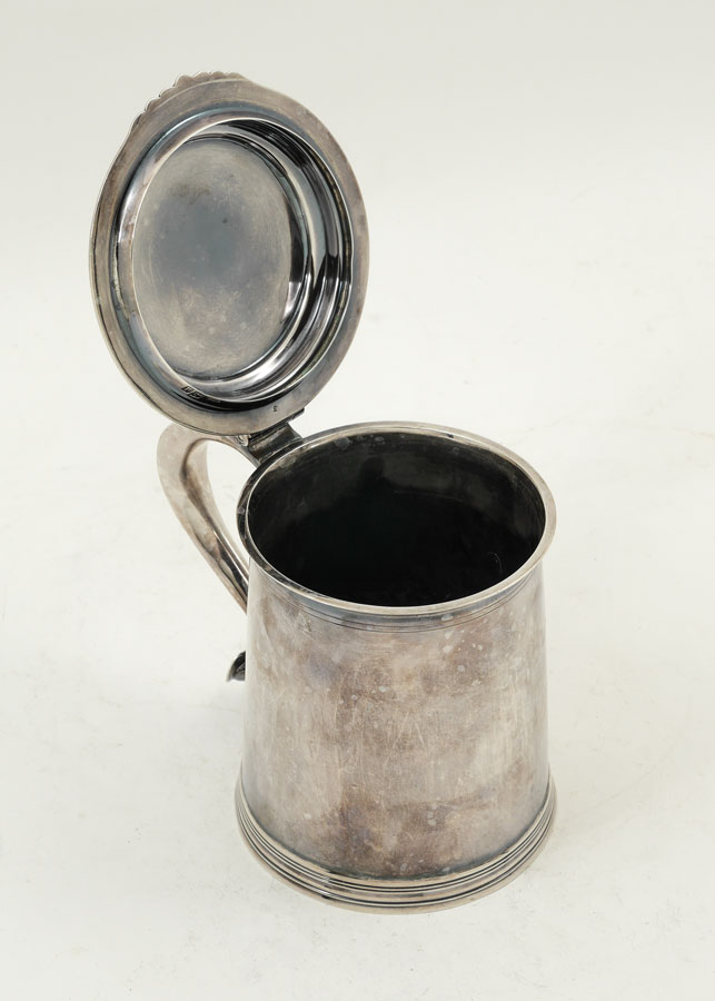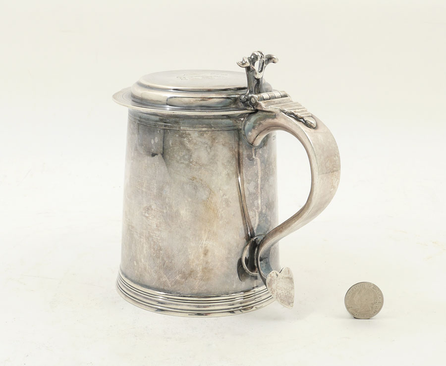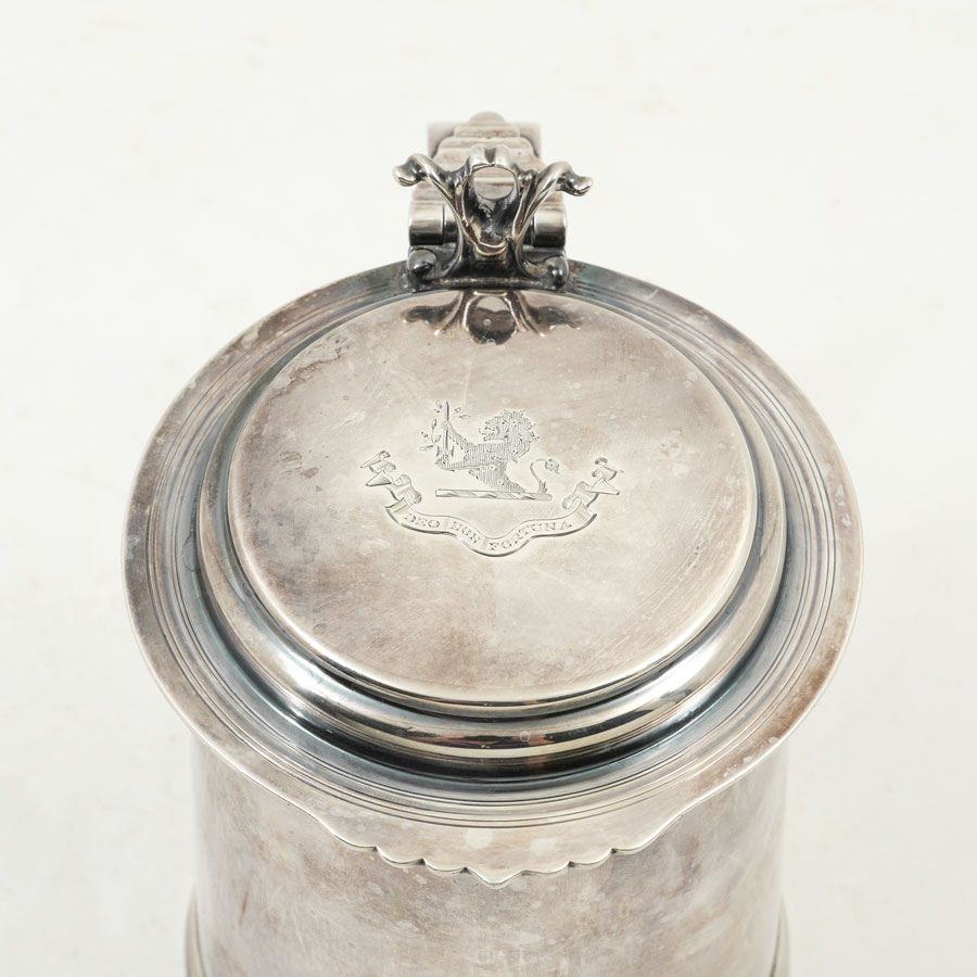 1899 HENRY STRATFORD ENGLISH SILVER TANKARD: Hinged lid with heralding rampant lion holding a sword over ''Deo Non Fortuna'' in banner. Well marked with Henry Stratford Ltd. 1899 London hallmarks. Measures 6 1/4'' h. x 7'', approx. 21.6 troy oz.