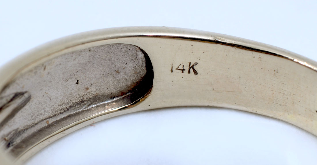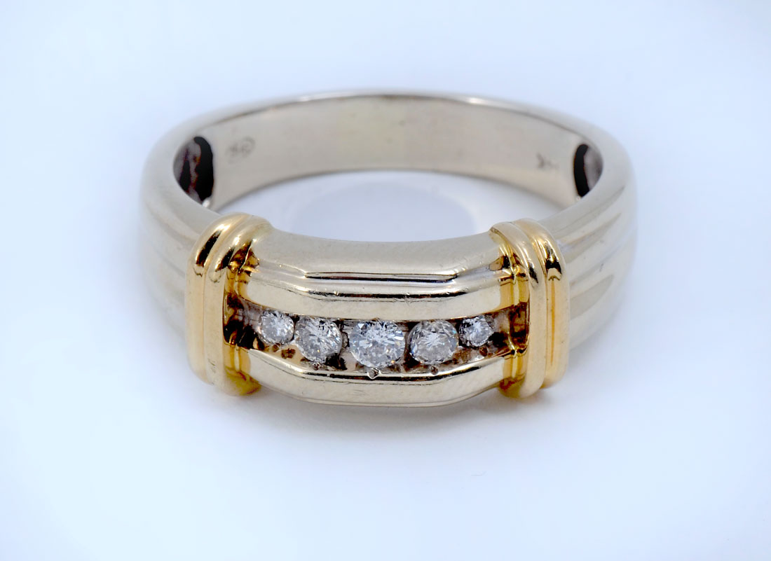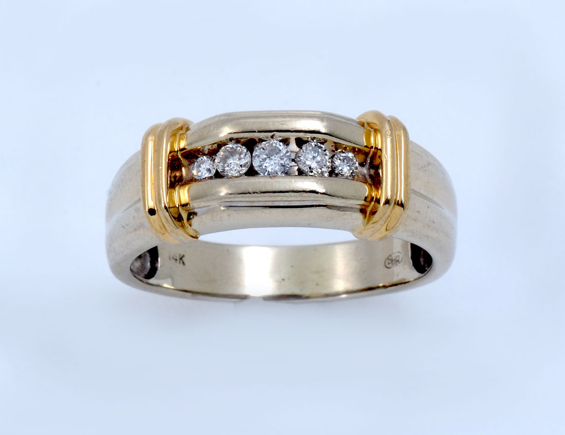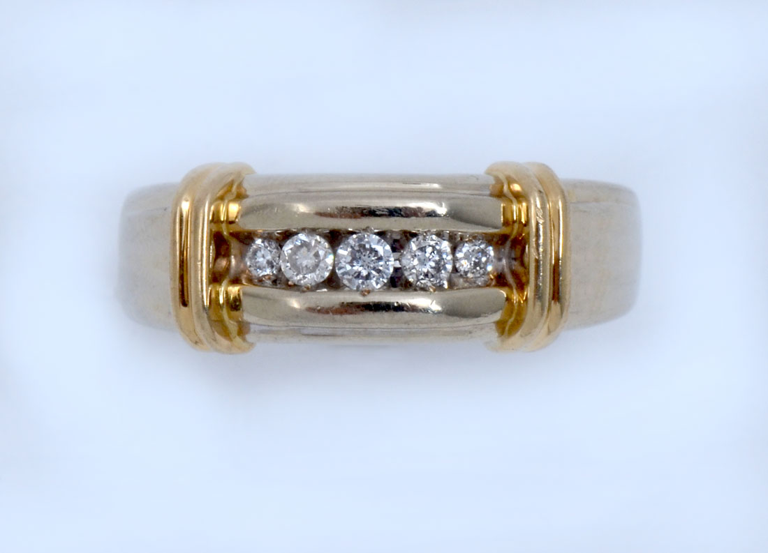 14K 2 TONE GOLD MEN'S RING WITH DIAMONDS: 14K yellow gold ring contains 5 round full cut diamonds. WEIGHT: .25 Ct. Approx. Rated I1 in clarity and H-I in color. The diamonds are channel set. Weight: 7.3 grams. Size: 12