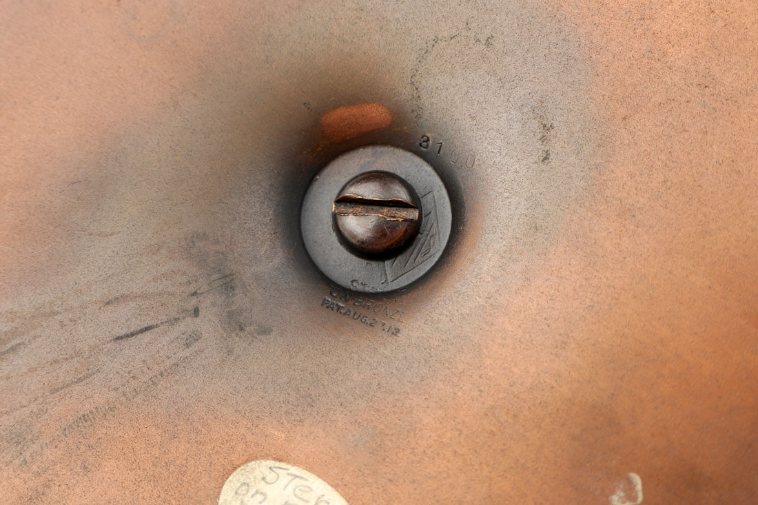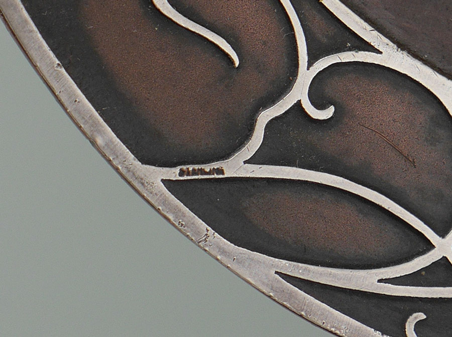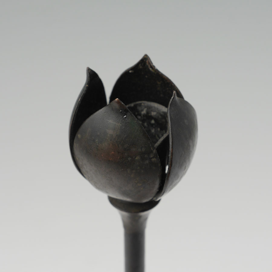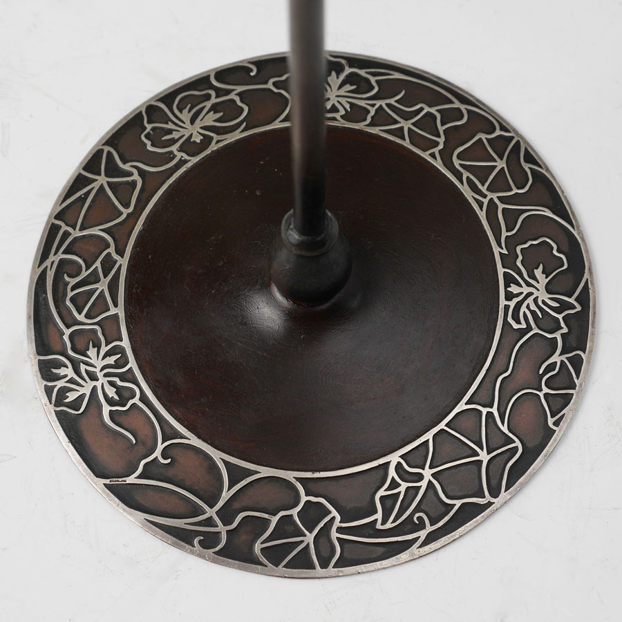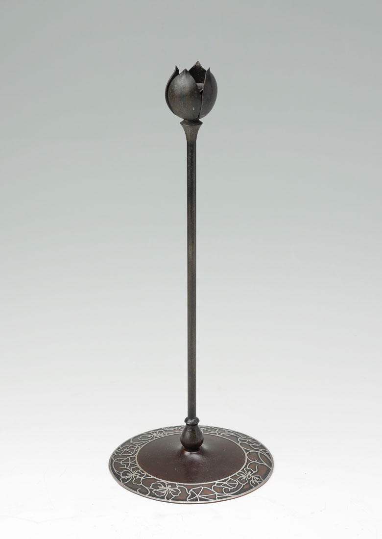 HEINTZ SILVER ON BRONZE CANDLESTICK: Patinated bronze candlestick, base with applied sterling silver foliate decoration, floriform bobeche, stamped marking on base, 14 1/2'' h. x 5 7/8''.