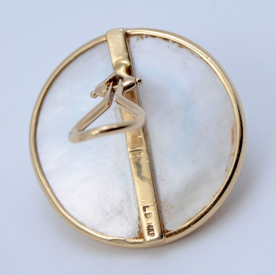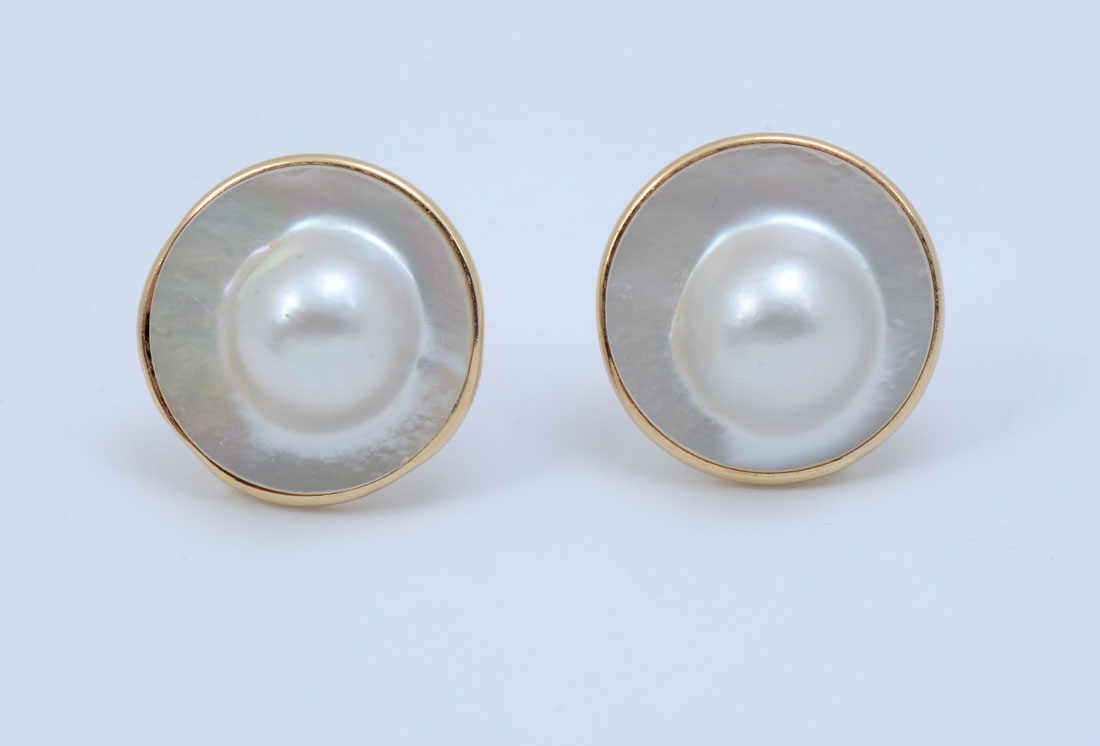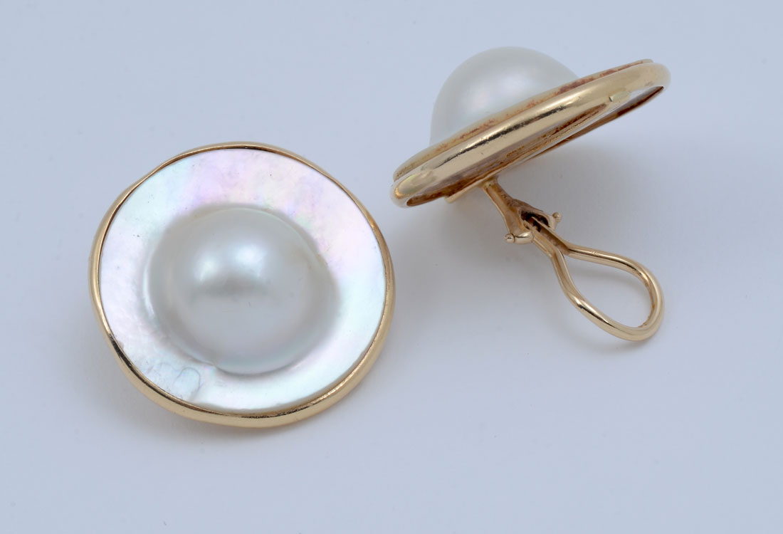14K BLISTER PEARL EARRINGS: 14K yellow gold framed 25.00 mm cultured blister pearls with hinged clip closures. Gold weight: 3.5 grams approx. Description provided by Graduate GIA Gemologist.