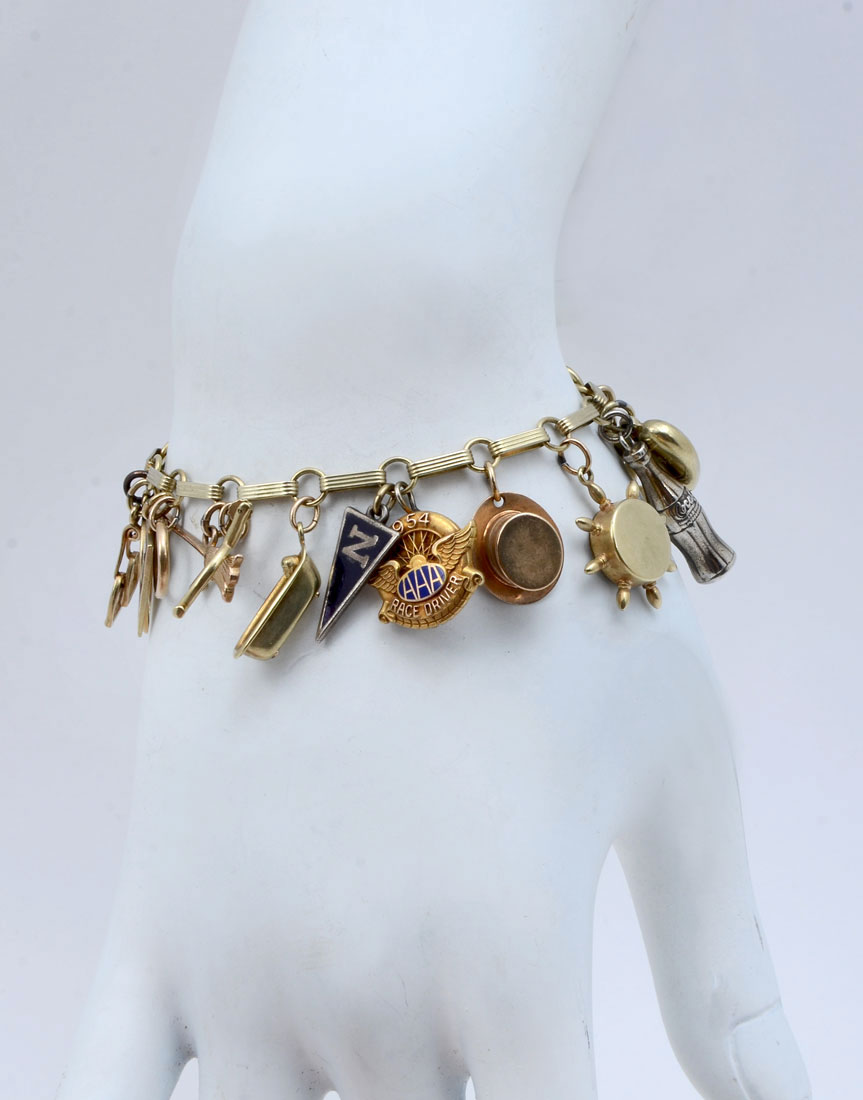 14K CHARM BRACELET W/ 17 CHARMS: 14K yellow gold link charm bracelet with (15) 14K, (1) sterling silver and (1) non-gold charms. Length: 7'' Weight: 43.7 grams. Description provided by Graduate GIA Gemologist.