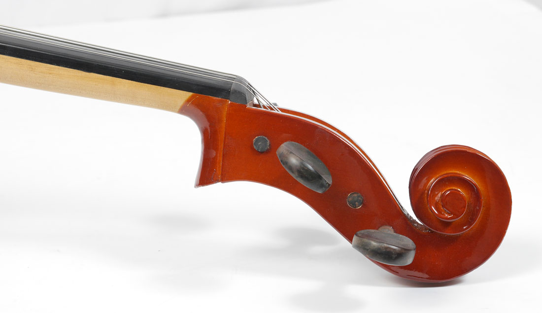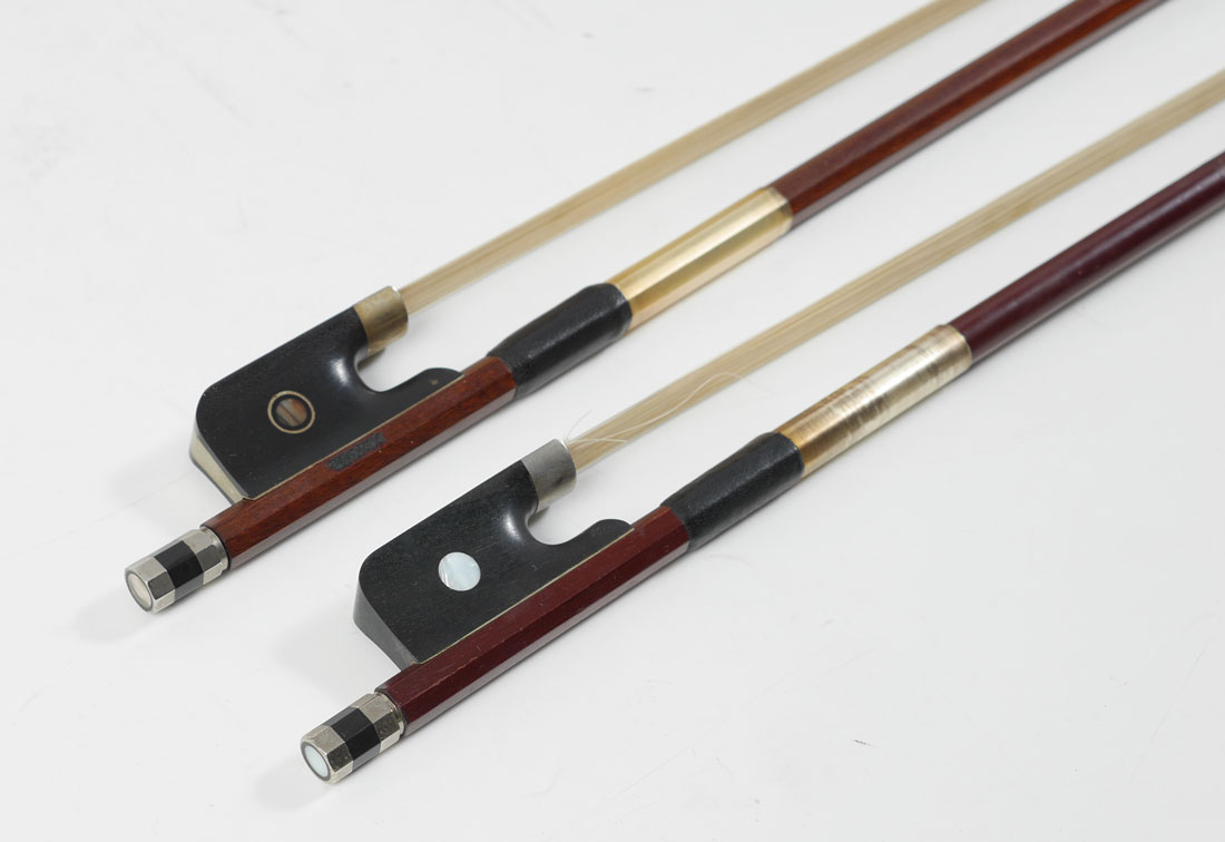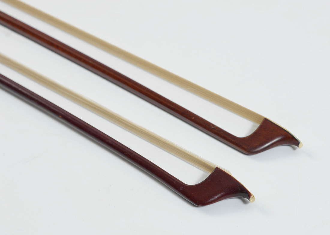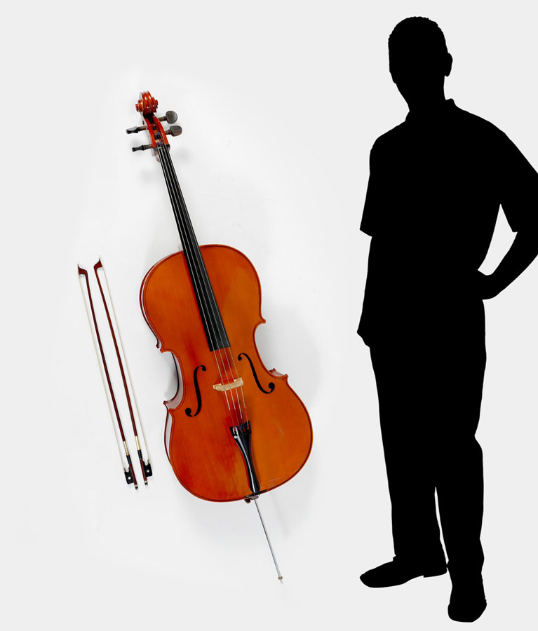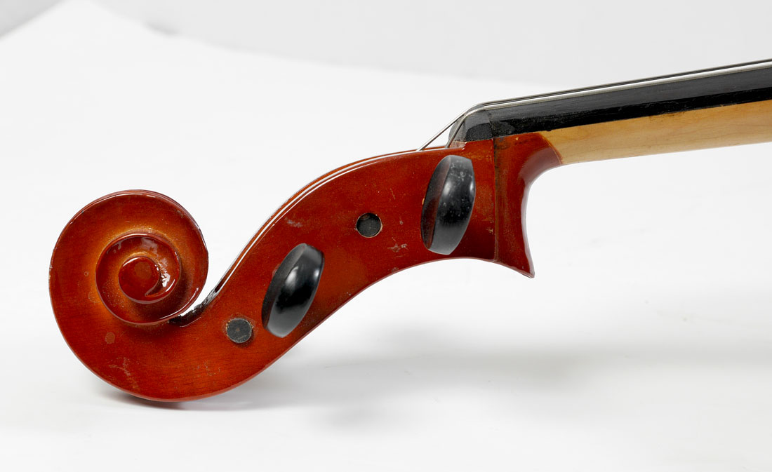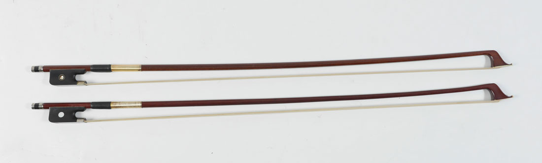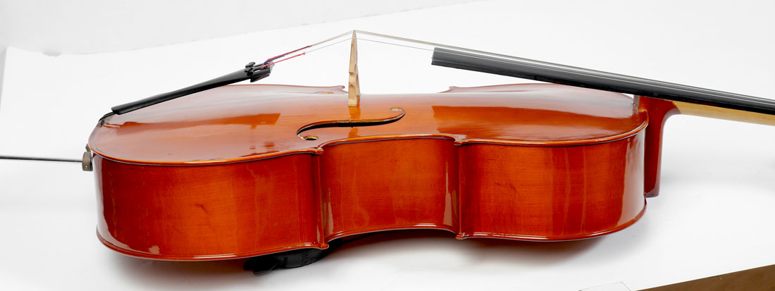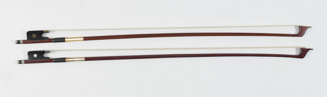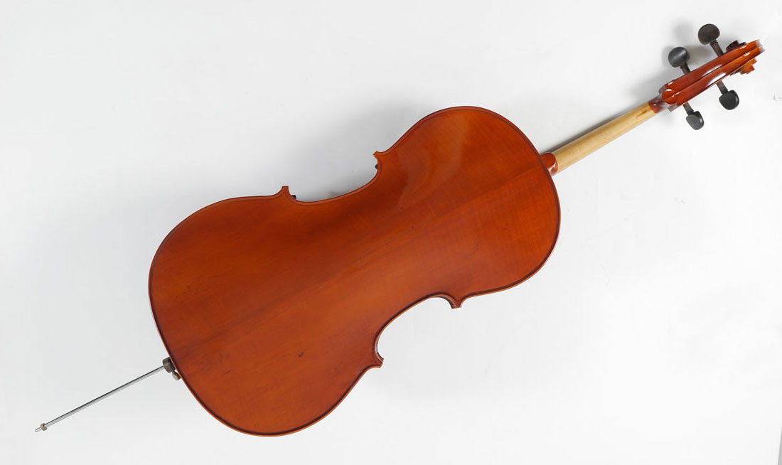STUDENT 4/4 CELLO WITH 2 BOWS: Unmarked full size cello, 2-piece back, measures 48'' h. x 17 1/4'', end pin measures 12''. Sold with 2 bows, one marked Meinel, the other unmarked, both 28'' long.