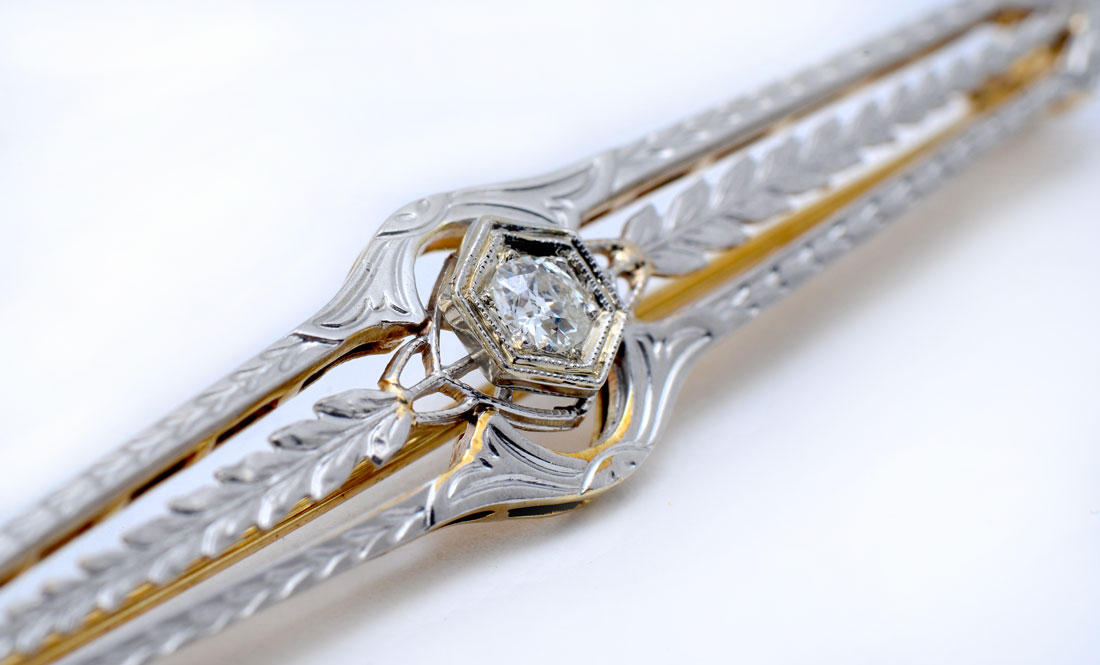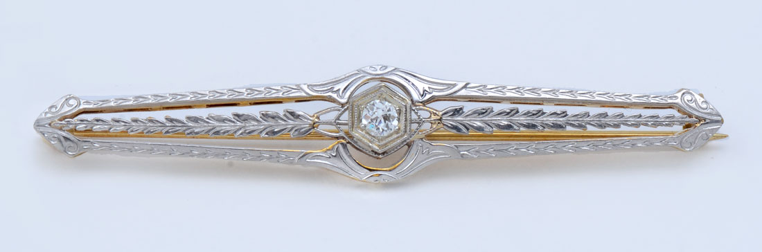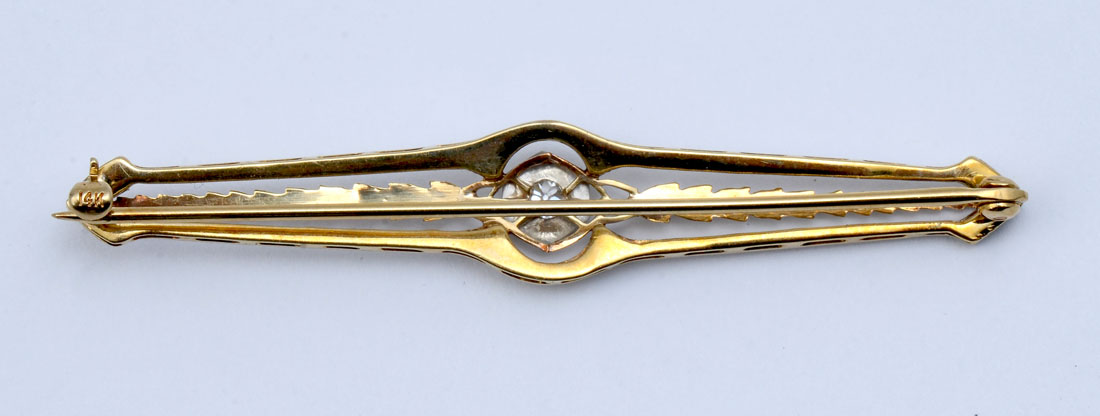14K DIAMOND BAR PIN: 14K yellow gold bar pin contains one old European round cut diamond. WEIGHT: .20 Ct. Approx. Rated VS in clarity and H-I in color. The diamond is prong set. Weight: 5.4 grams. Length: 2.5''