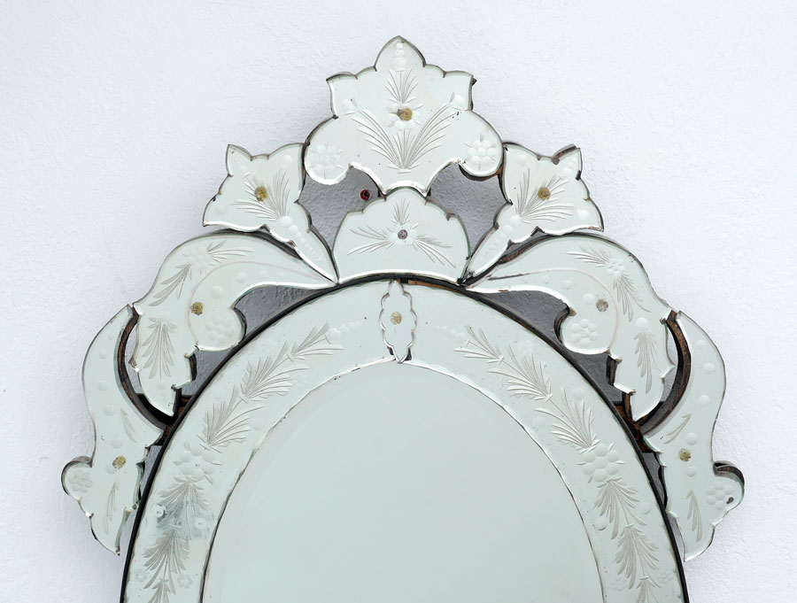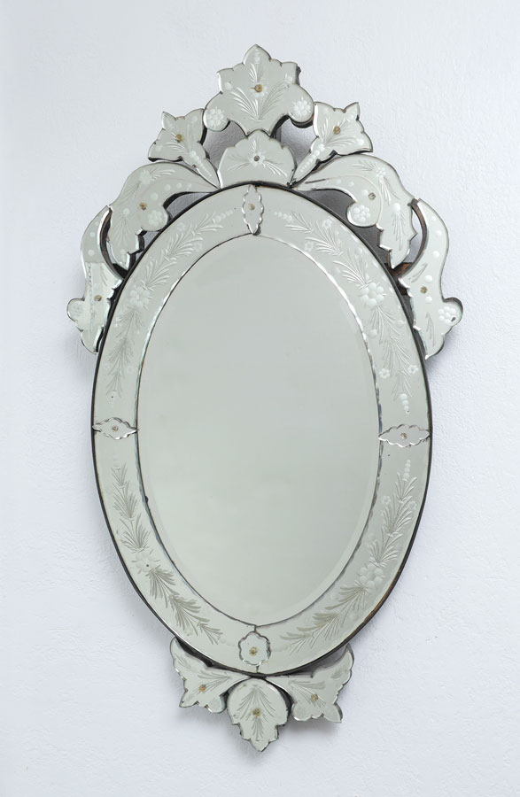 VENETIAN STYLE WALL MIRROR: Foliate scroll crest over oval medallion over lower crest, etched foliate designs, 40 h. x 23 1/2'' x 2 1/4''.