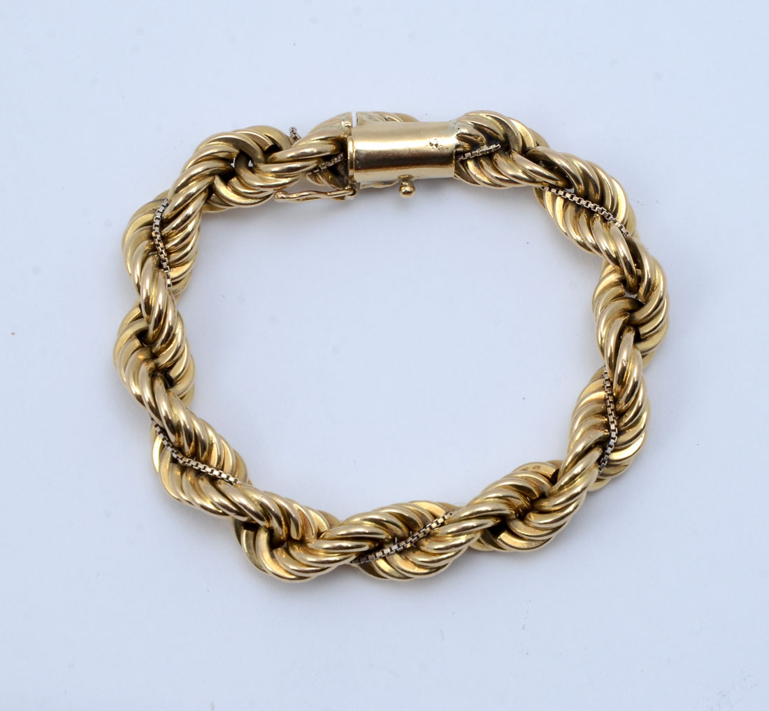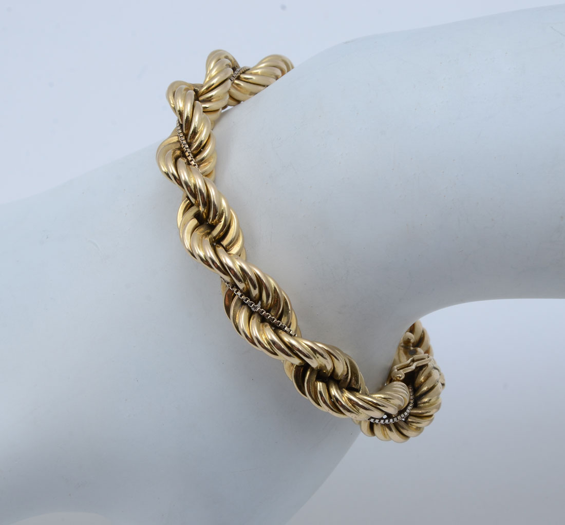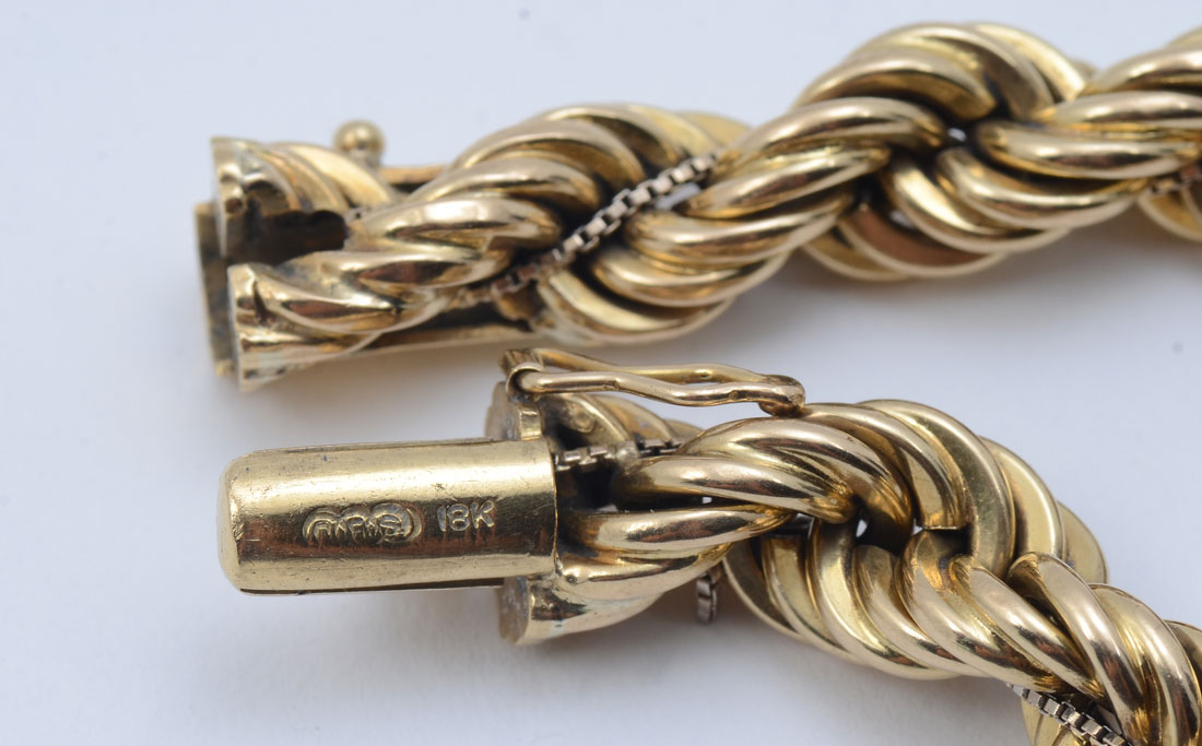 18K 31.5 GRAM ROPE TWIST GOLD BRACELET: 18K yellow gold box wrapped solid rope bracelet. Width: 3/8'' '' Length: 7'' Weight: 31.5 grams. Description provided by Graduate GIA Gemologist.