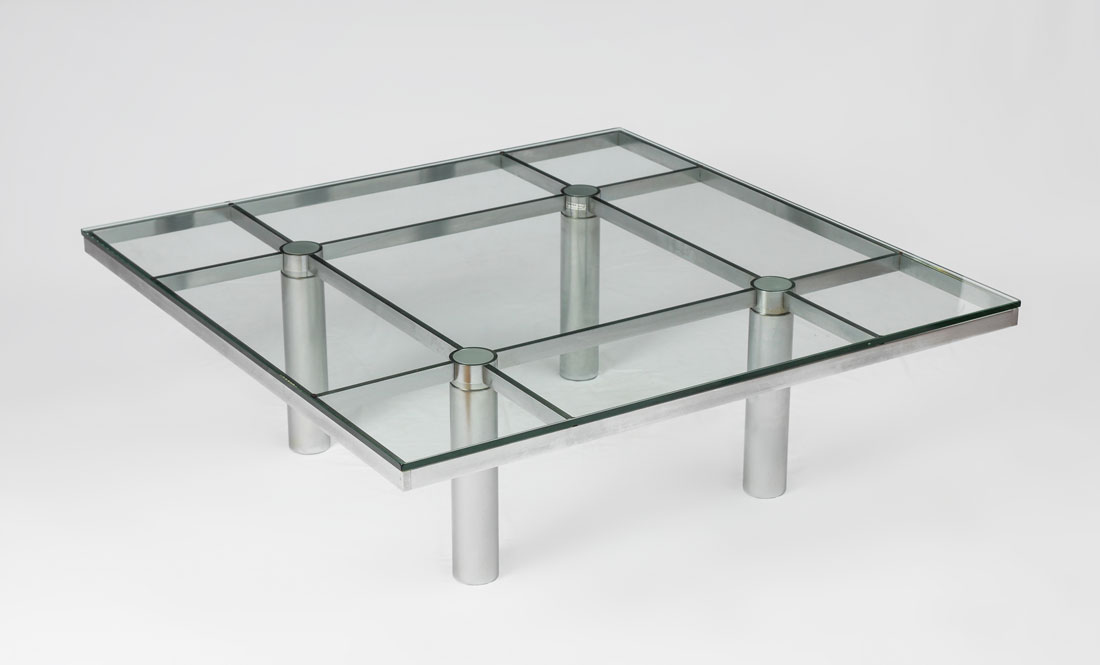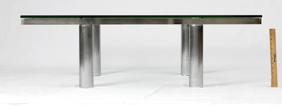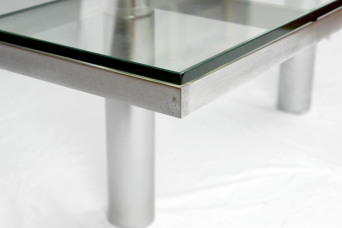 TOBIA SCARPA FOR GAVINA / KNOLL COFFEE TABLE: Square glass top on chrome base with cylinder legs. Original Gavina foil label. Overall measures 15 1/2'' h. x 45'' x 45''.