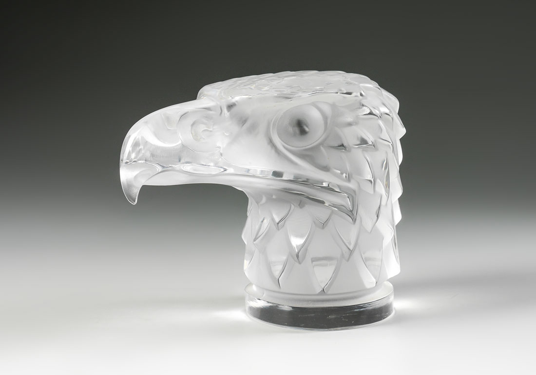 LALIQUE TETE D'AIGLE FROSTED EAGLE CAR MASCOT: Figural head of an eagle, frosted and clear crystal signed Lalique France, 4 1/4'' h. x 6''.