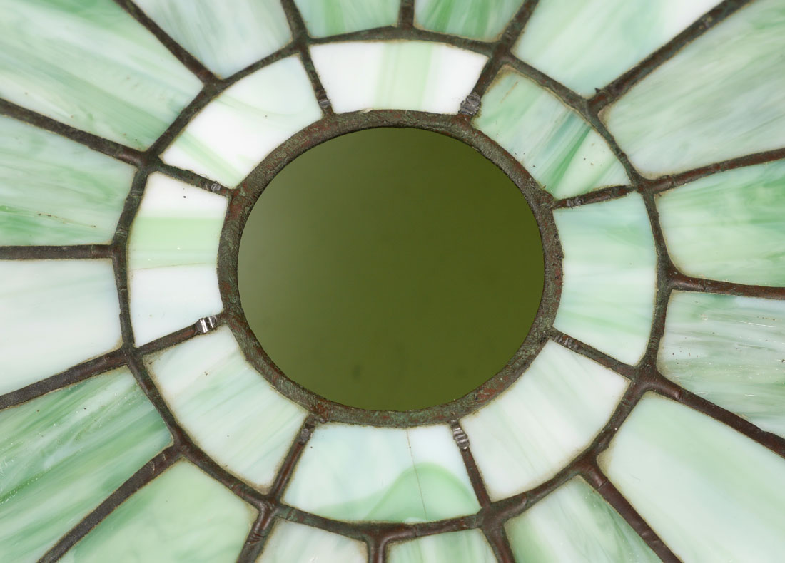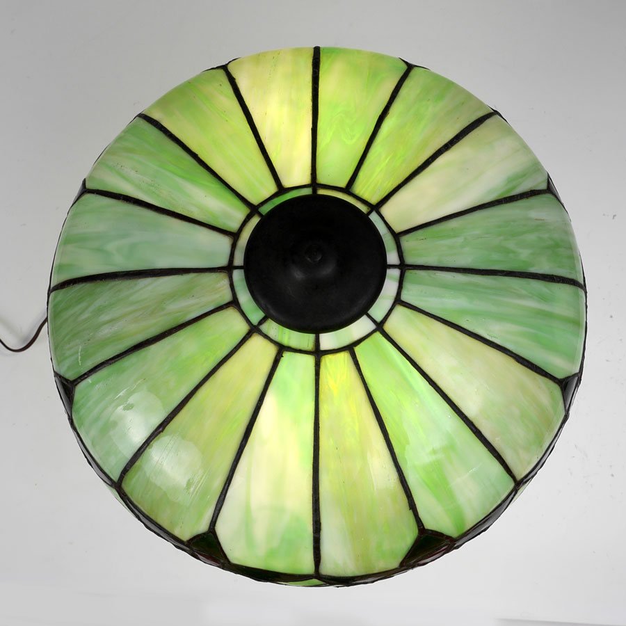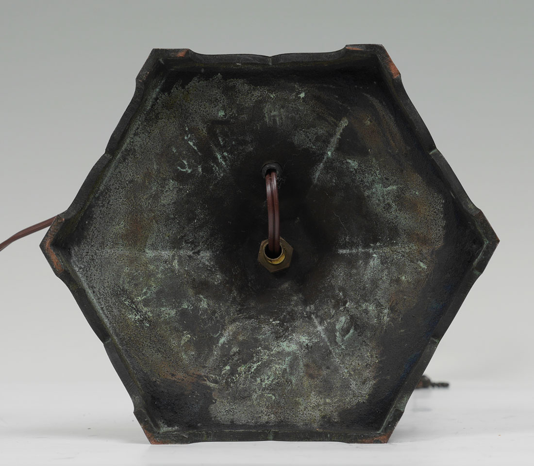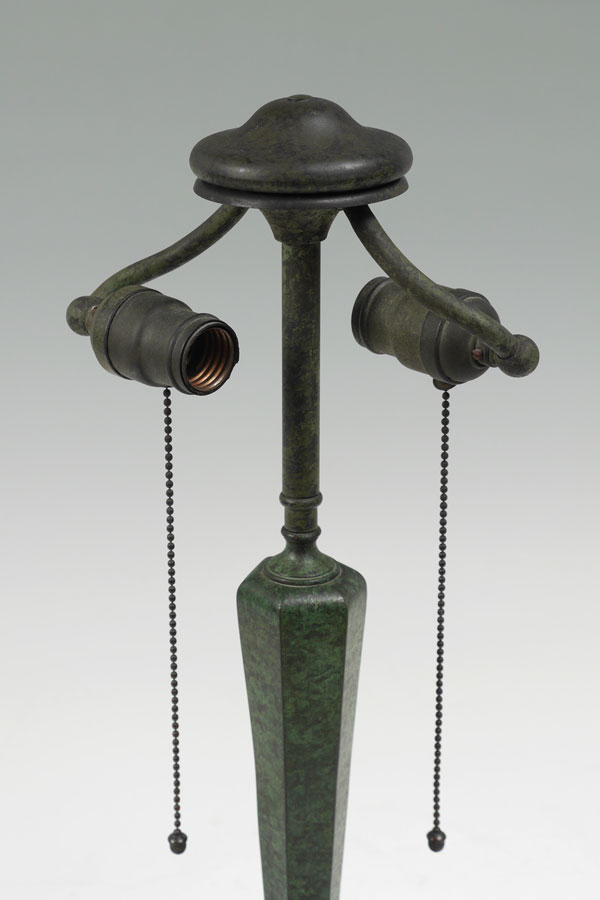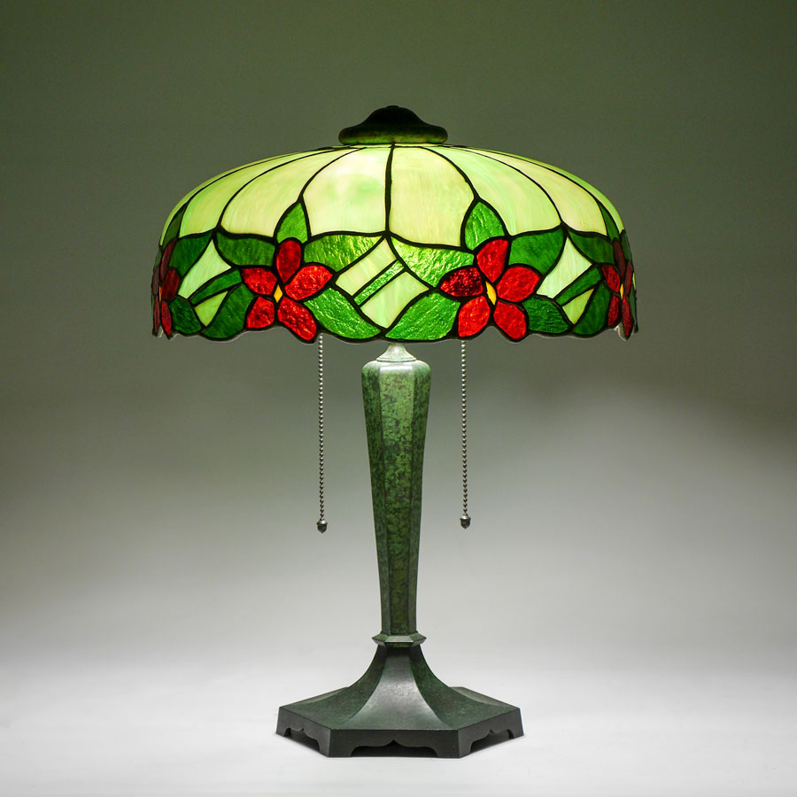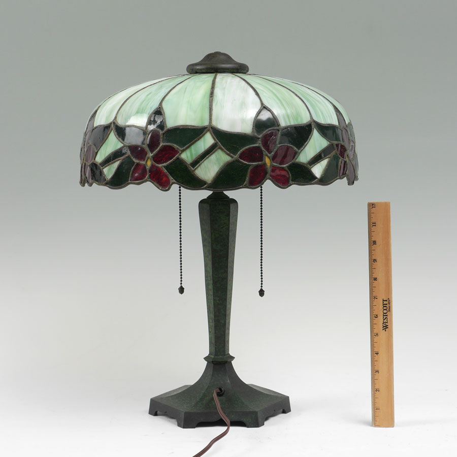 FLORAL LEADED BENT SLAG GLASS TABLE LAMP: Verdigris patinated cast metal base, double socket fixture, no visible markings, 20 1/2'' h. x 6 3/4''. Green bent panel slag glass with floral border, measures 6 3/4'' x 15 1/2''.