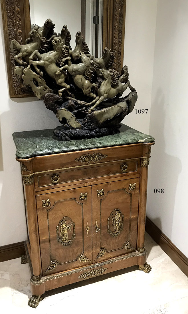 ITALIAN STYLE METAL MOUNTED MARBLE TOP CHEST: Green variegated marble top with cookie corners, single drawer over 2 doors, gold decorated metal mounts and applied decoration, paw feet. 40 3/4'' h. x 35'' x 19''.