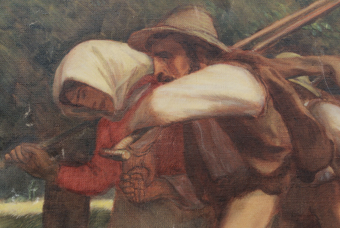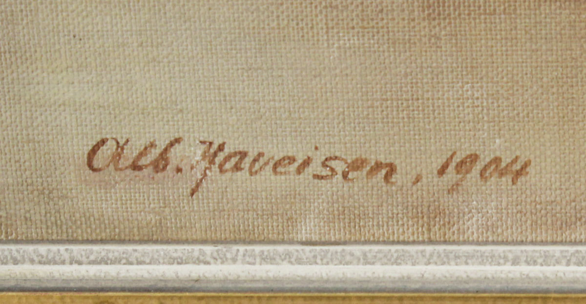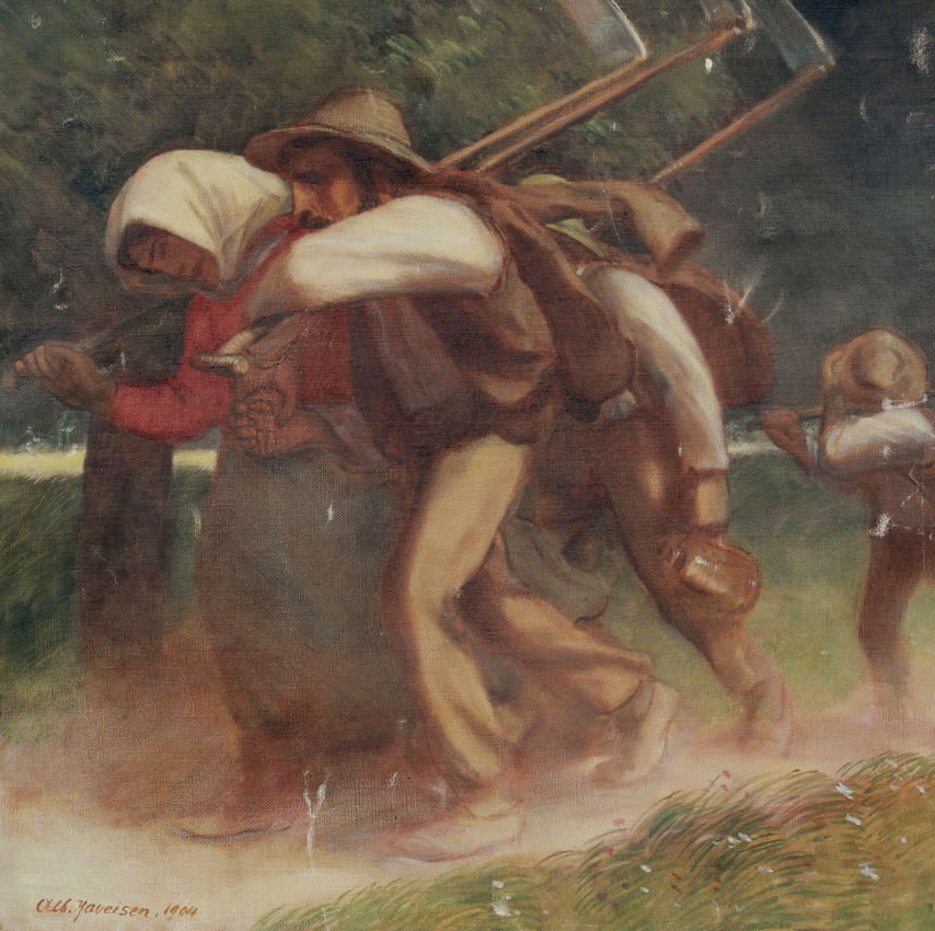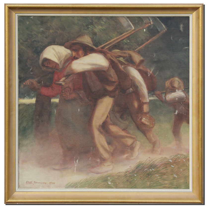 HAUISEN, Albert, (German, 1872-1954): Weary Workers Traveling along the Path, Carrying their Sickles, Oil/Canvas, 23 5/8'' x 23 7/8'', signed lower left, date 1904, later gilded frame with minor wear, 26 1/2'' x 26 1/2''.