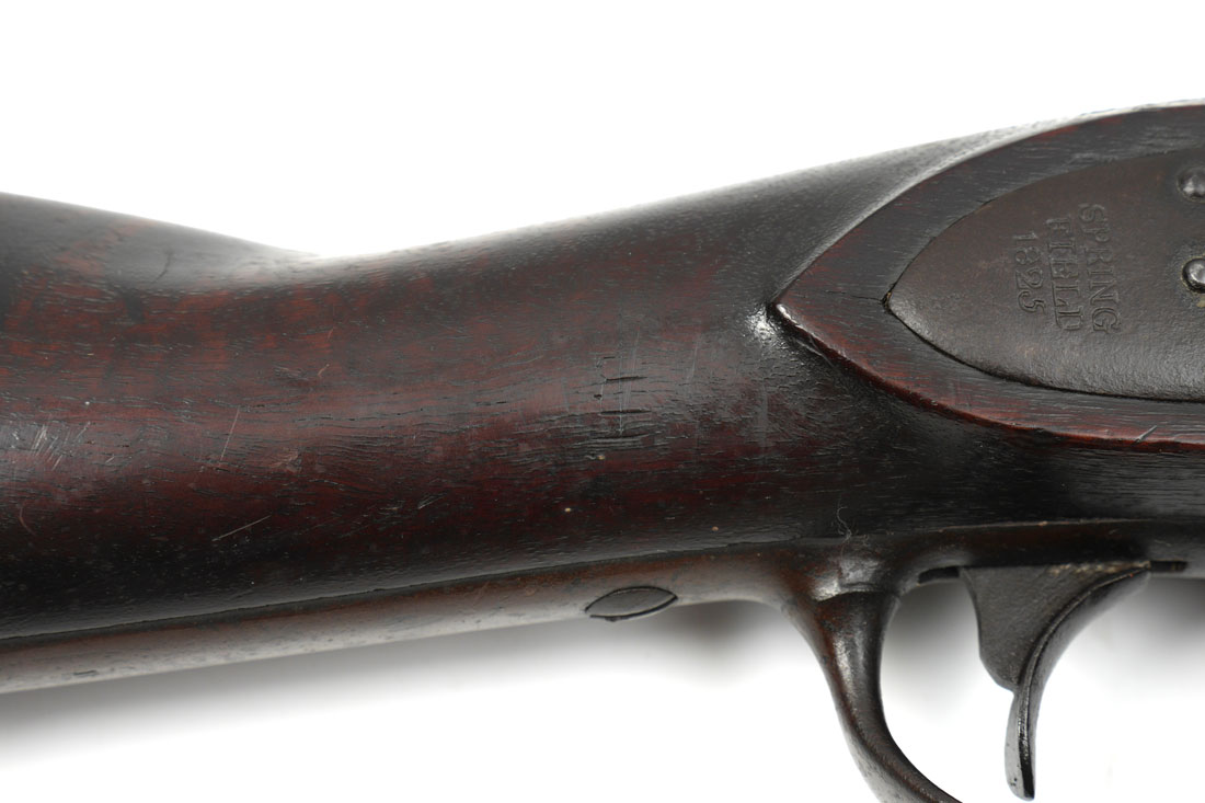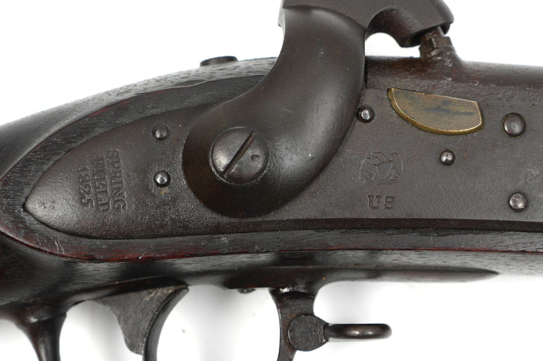 MODEL 1816 US SPRINGFIELD MUSKET DATED 1825: Converted to percussion, typical US Springfield markings on lockplate, several inspector cartouche on full stock, 42'' approx. .69 caliber round barrel, chocolate brown patina. Action works, overall 57 3/4'' long.