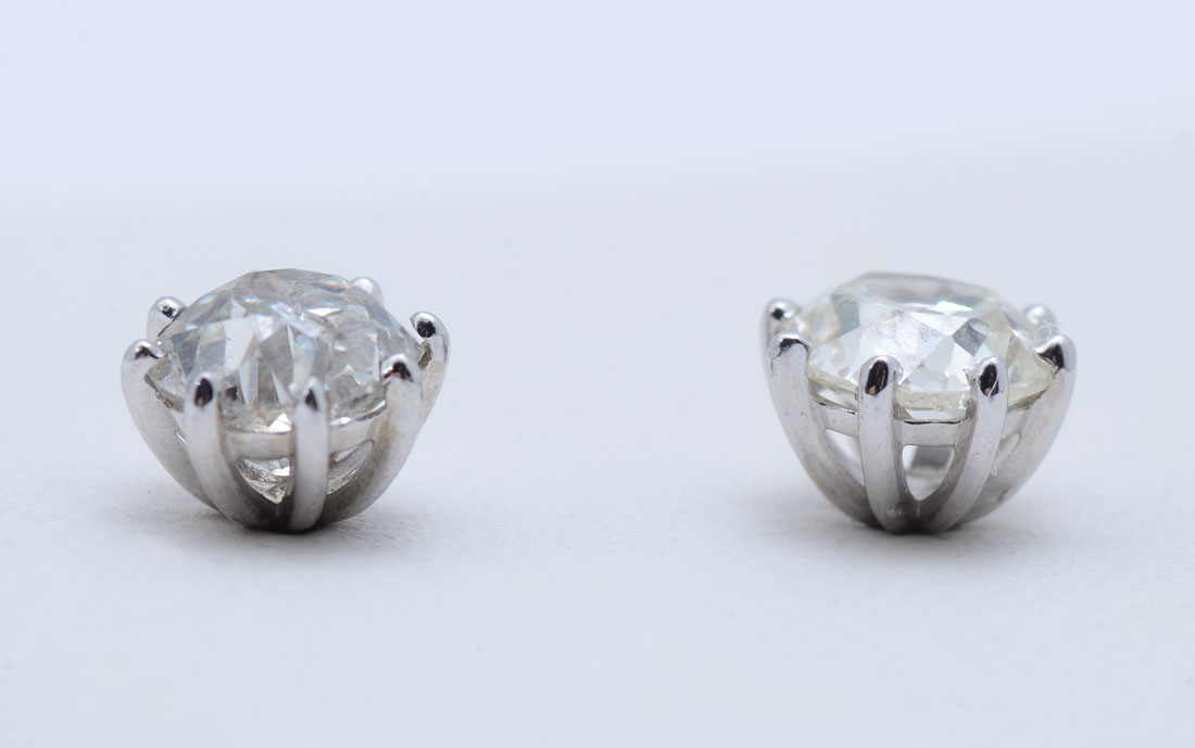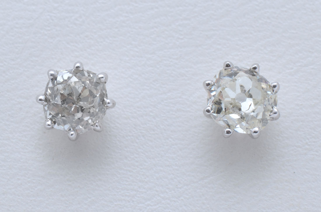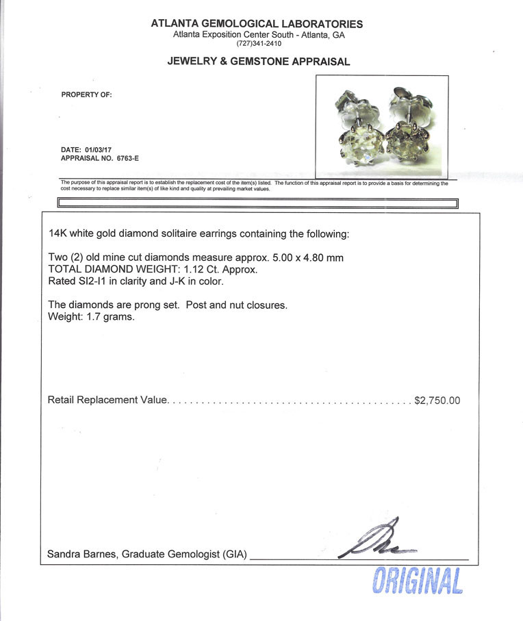 14K DIAMOND STUDS: 2 old mine cut diamonds approx. 1.12CTW, rated SI2-I1 in clarity and J-K in color. Post and nut closures. Total weight 1.7 grams. Sold with current Atlanta Gemological GIA graduate's appraisal for $2750.