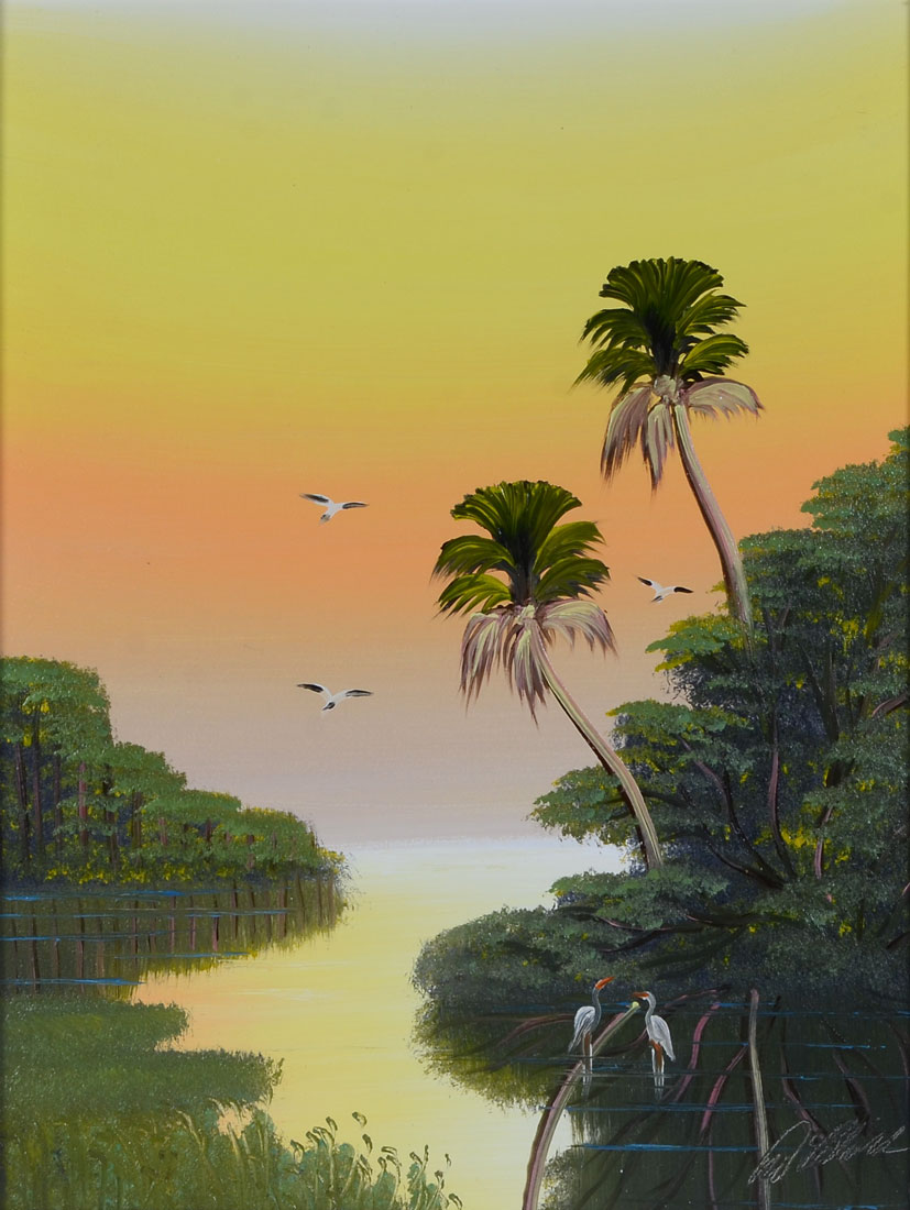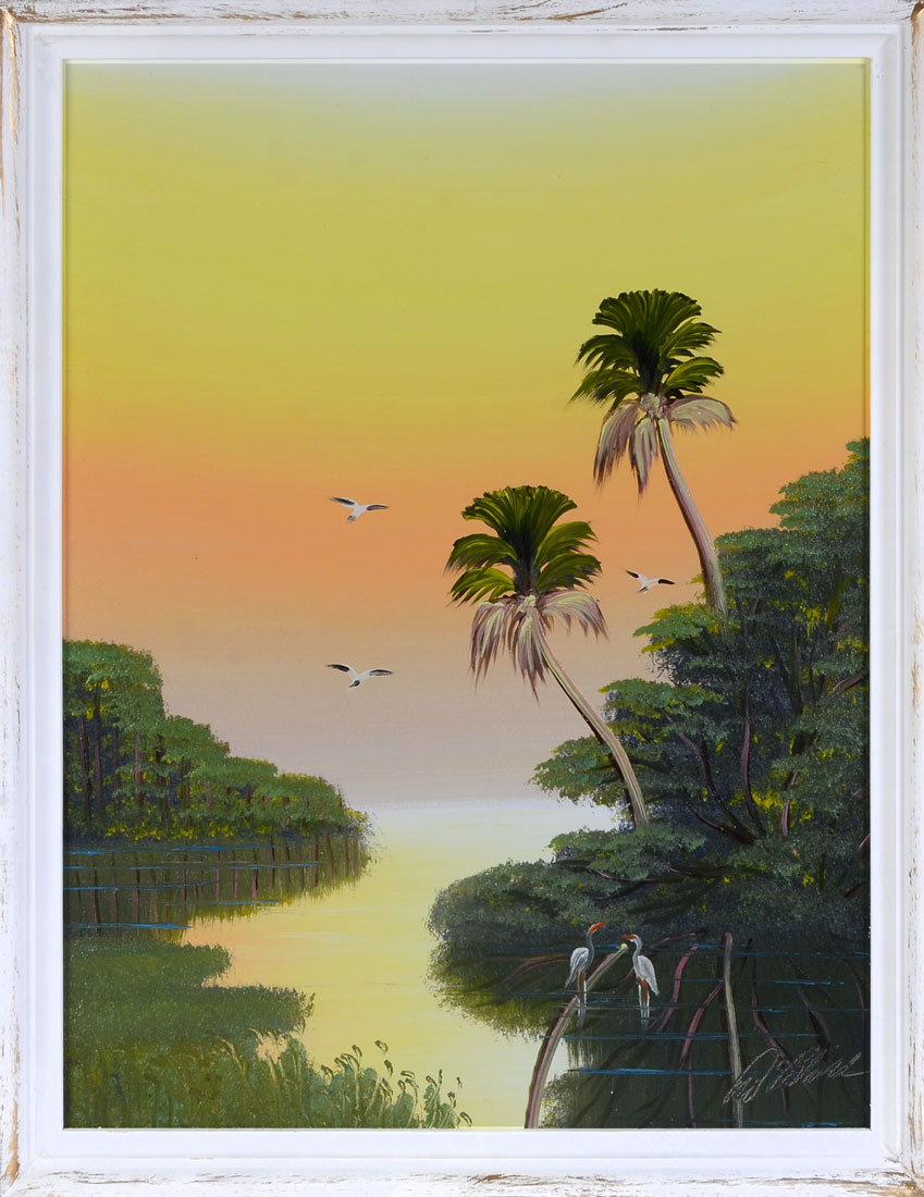 BLACK, Al, (American, 20th Century): Florida Highwaymen St. Lucie River sunrise scene with bird, Oil/Masonite, signed lower right, 24'' x 18'', framed 25 1/2'' x 19 1/2''.