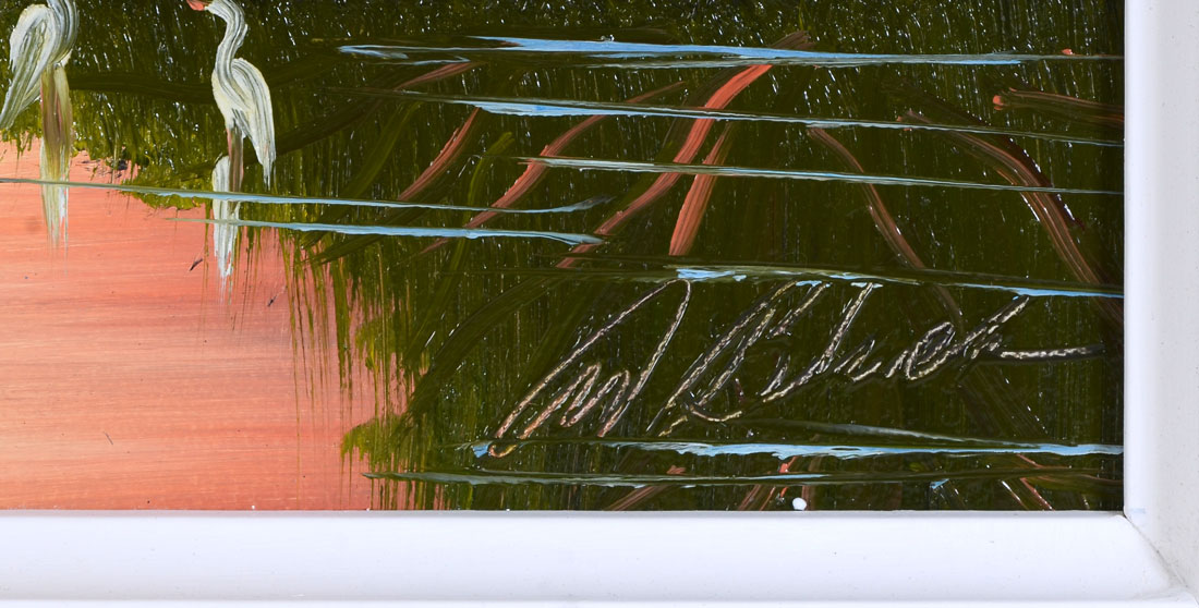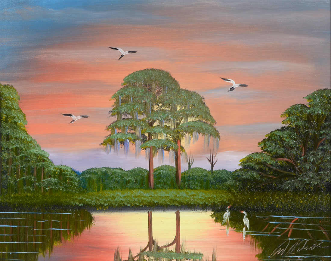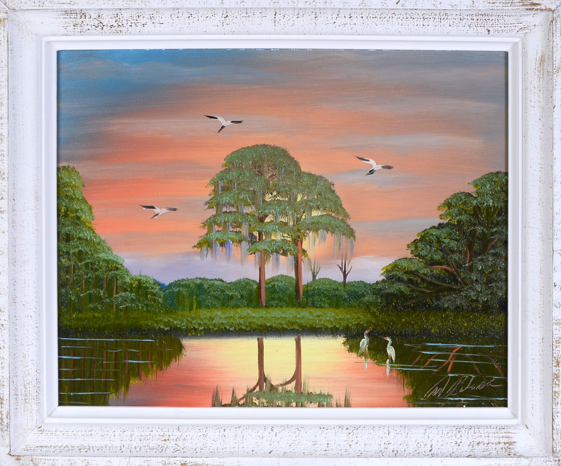 BLACK, Al, (American, 20th Century): Florida Highwaymen backwaters scene with cyprus trees and birds, Oil/Masonite, signed lower right, 16'' x 20'', framed 19 1/2'' x 23 1/2''.