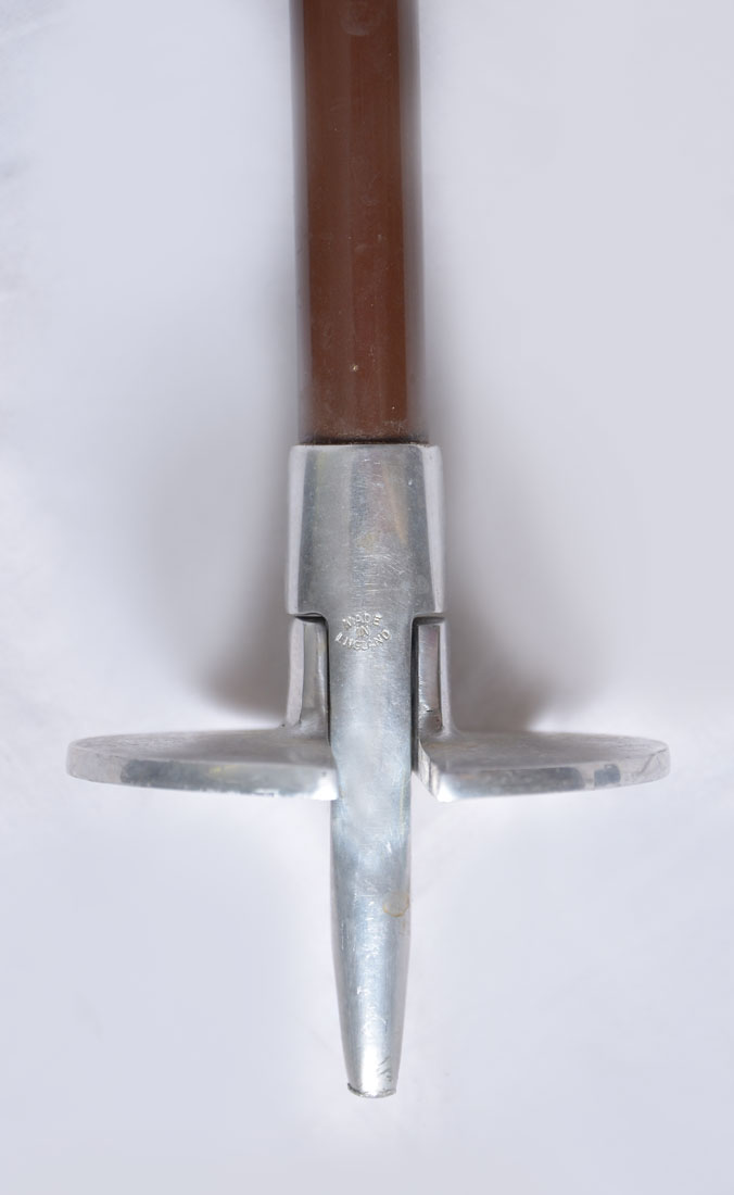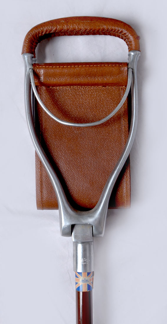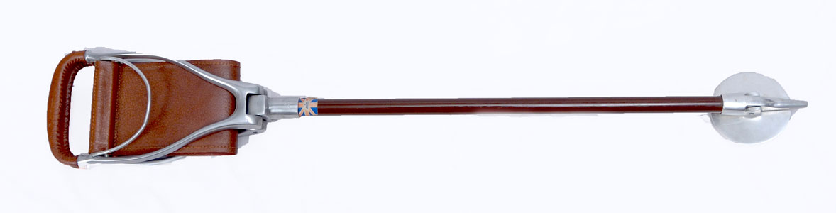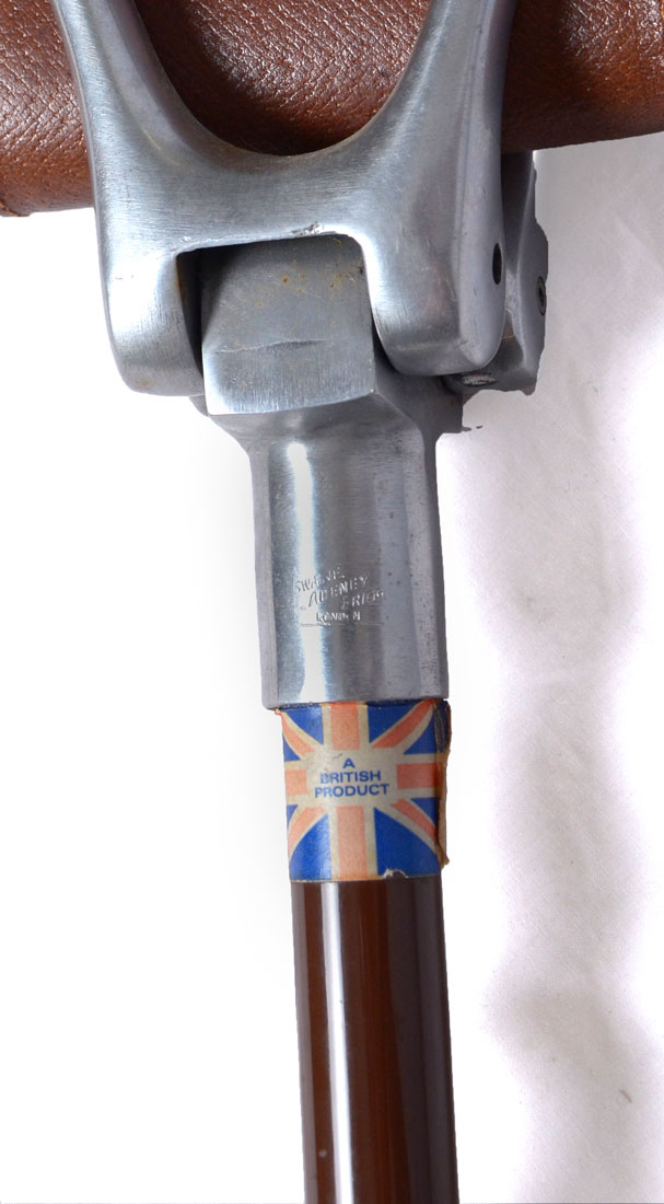 SWAINE ADENEY BRIGG ENGLISH FOLDING GOLF STICK STOOL: Folding leather seat converts to a walking stick, swing out base for leverage when sitting, marked on metal collar of shaft. Overall 35'' long when closed.