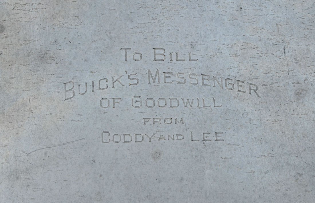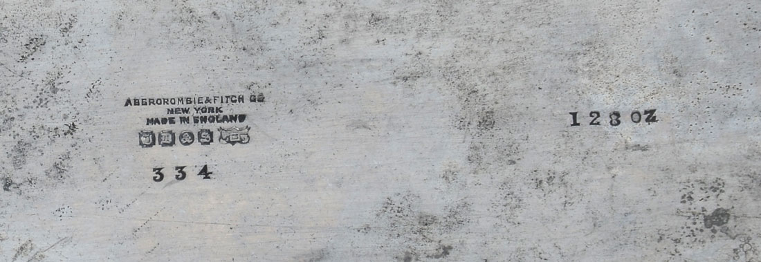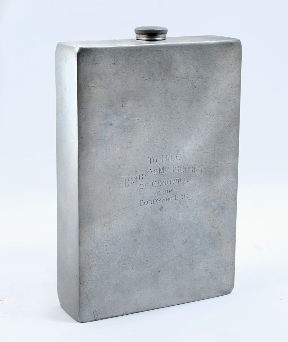 LARGE ABERCROMBIE AND FITCH SILVER PLATED FLASK: Makers mark of James Dixon & Sons, Sheffield, England, stamped ''Abercrombie & Fitch Co'', New York, Made in England, 12'' h., 8'' w; 64oz, inscribed ''To Bill, Buick's Messenger of Goodwill from Coddy and Lee''.