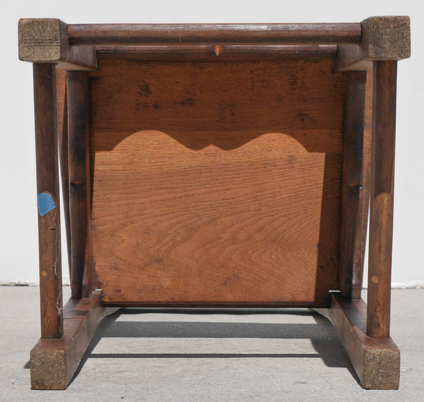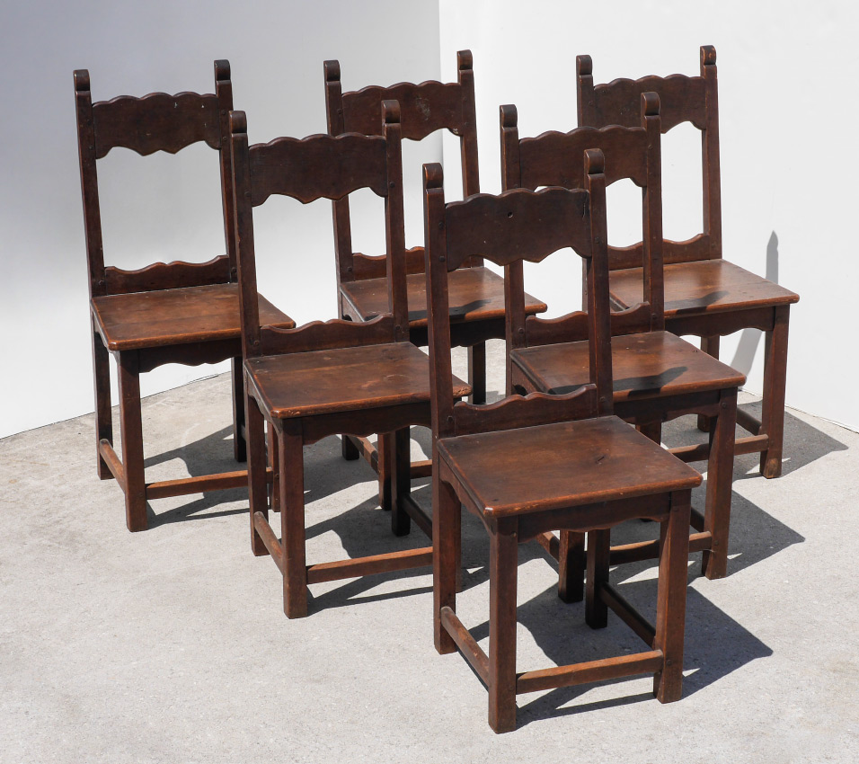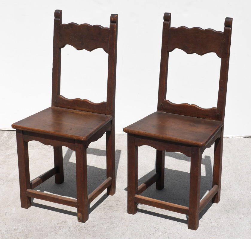 SIX 18TH CENTURY CONTINENTAL SIDE CHAIRS: Shaped top and lower rails on back, frames with pegged construction, hand forged nails on seats, 37 3/4'' h. x 16 1/2'' x 17 1/2''.