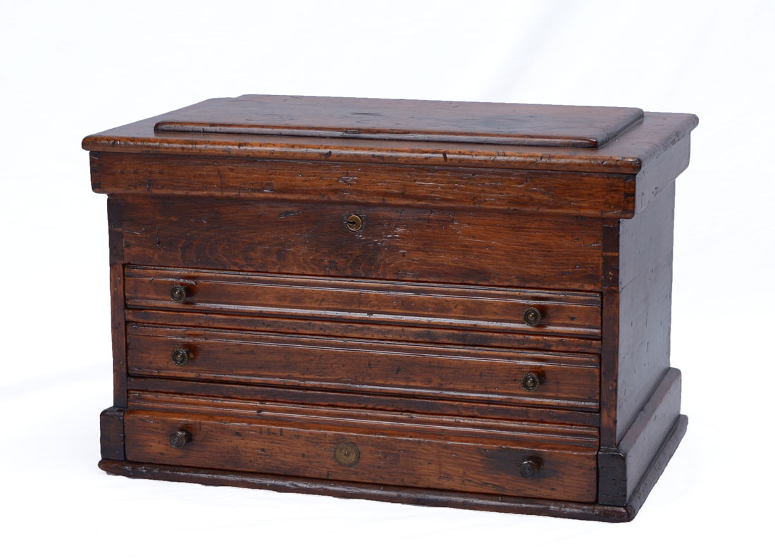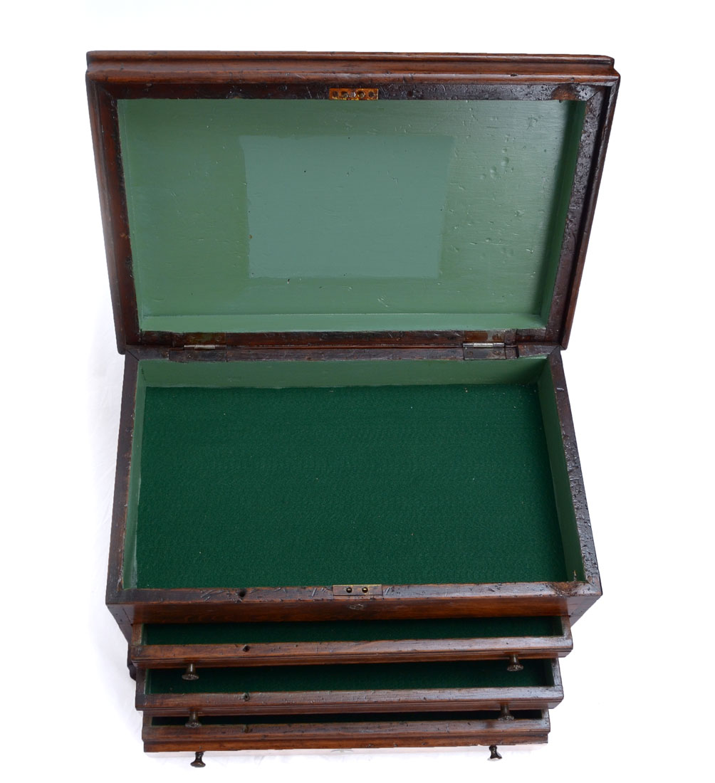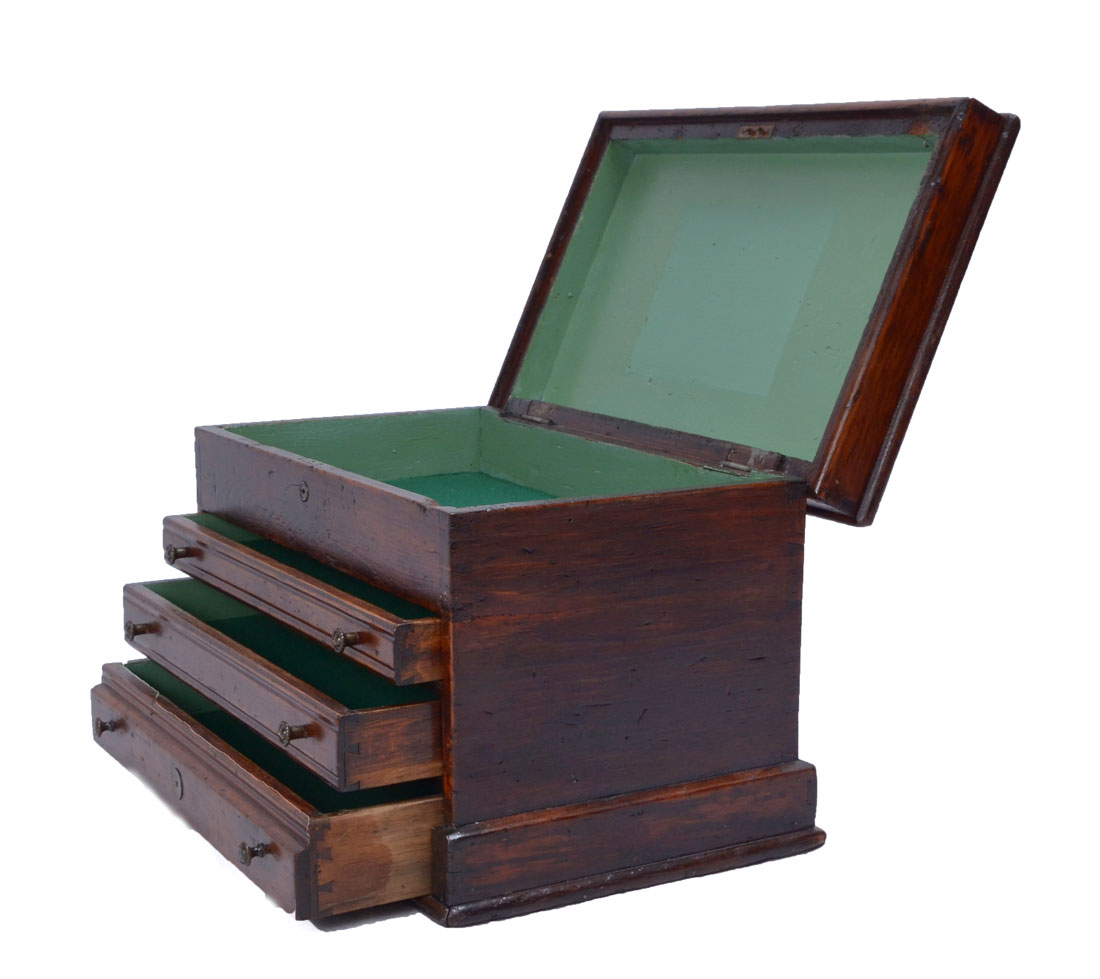 19TH CENTURY WALNUT SILVER CHEST: Hinged lid with green painted and felt lined interior over 3 felt lined graduated drawers. Brass tag on lower drawer marked Hudson. Overall measures 14'' h. x 22'' x 14 3/4''.