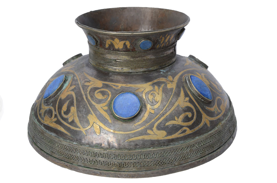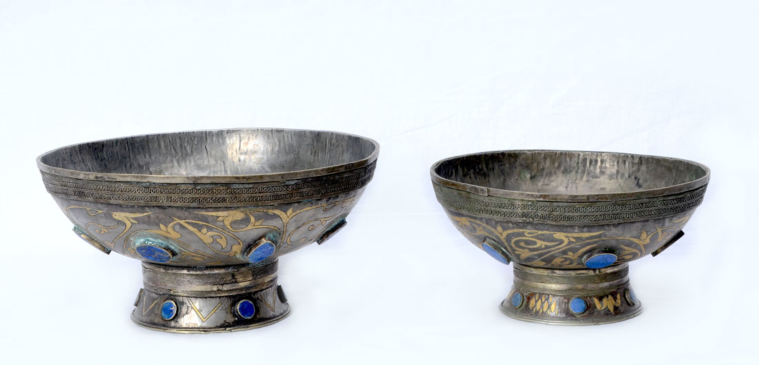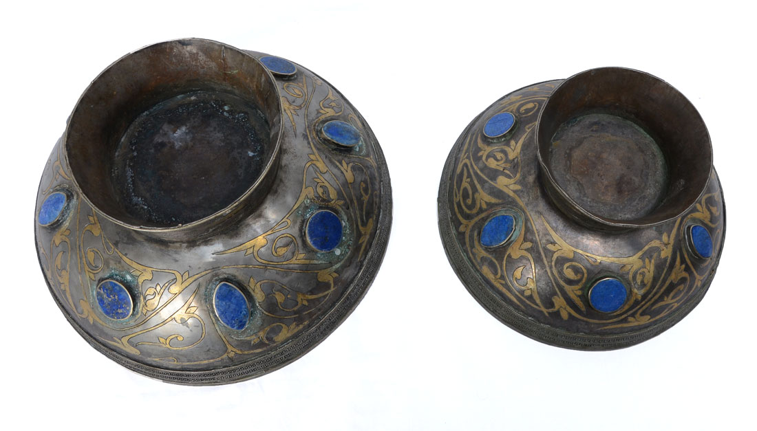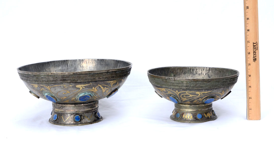 2 MIXED METAL LAPIS LAZULI INSET FOOTED BOWL: Hand hammered bowl, most likely Indo-Persian, wire worked rim, silver metal body with gold toned inlaid foliate designs, applied lapis lazuli cabchons, on footed base, no visible markings. larger measures 5'' h. x 10 1/4'', smaller 4 1/2'' h. x 8 1/2''.