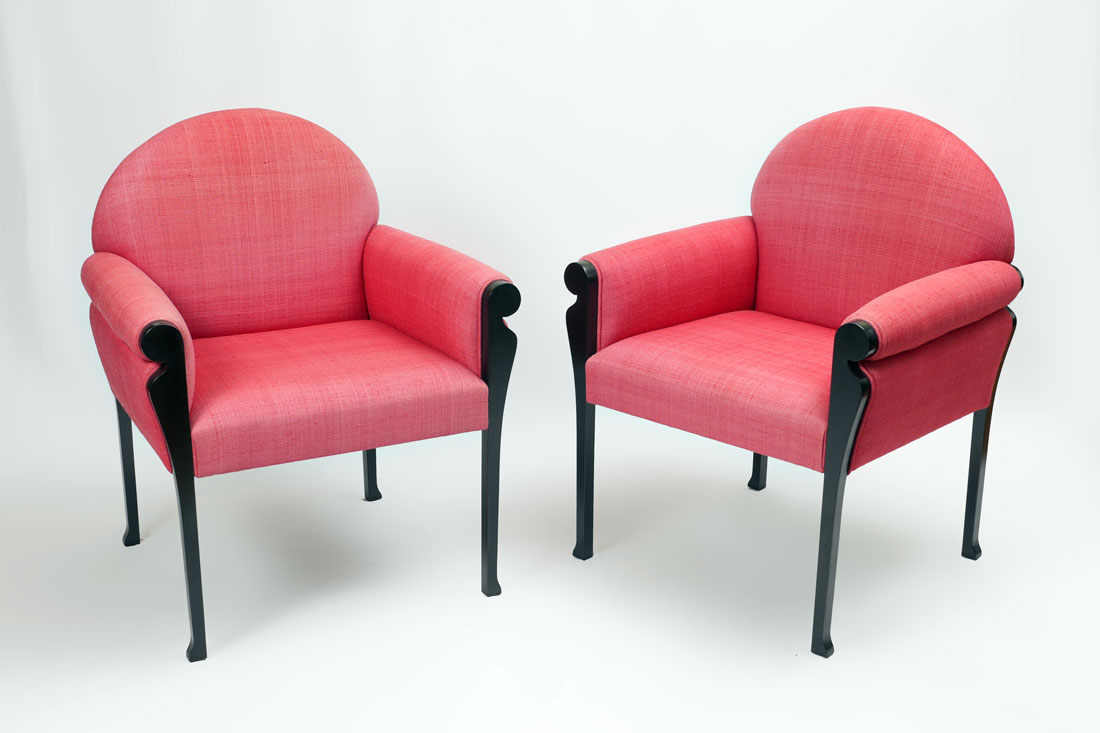 2 KARL SPRINGER STYLE ARM CHAIRS: Salmon colored upholstered chairs attributed to Karl Springer, ebonized wood legs and arm supports, 36'' h. x 27'' x 30''.