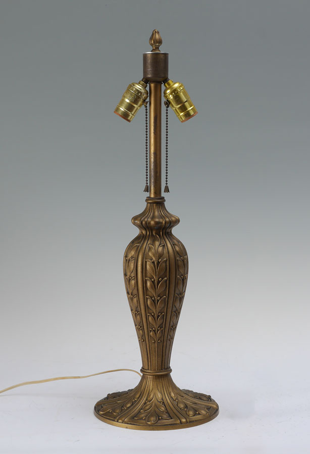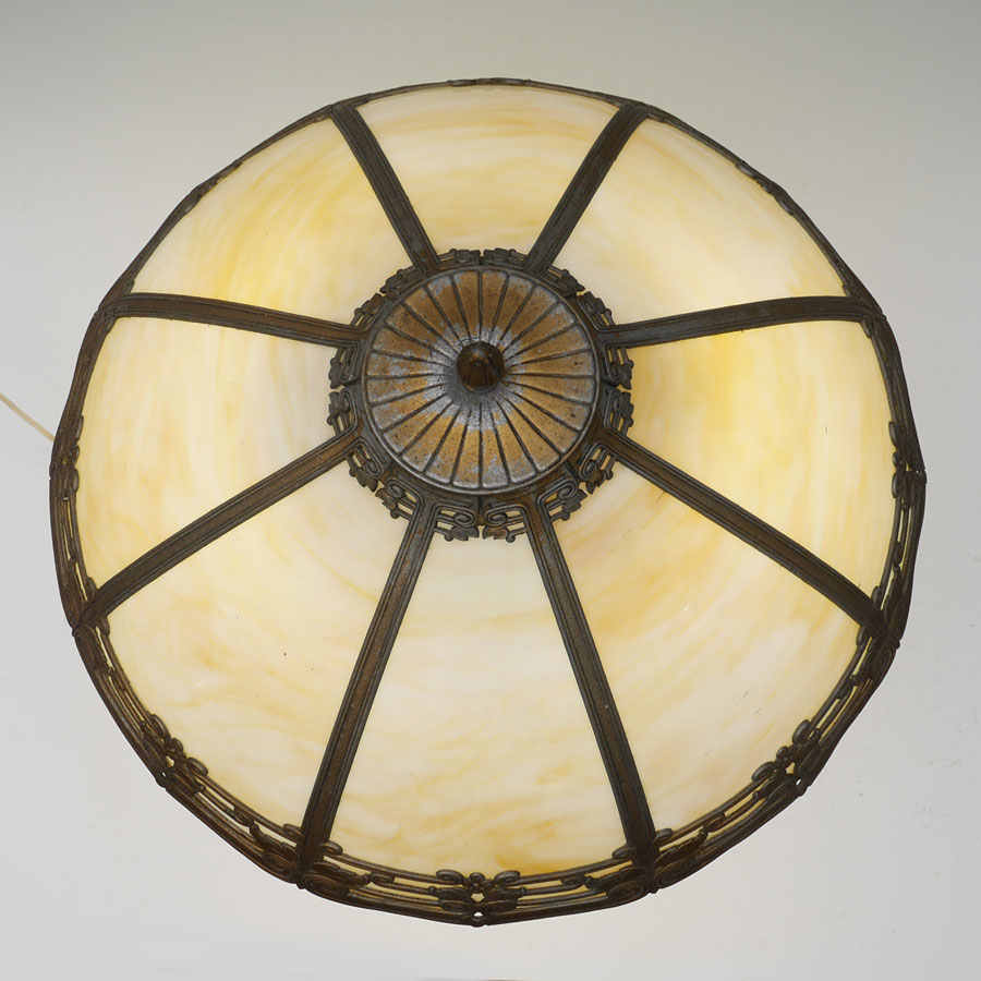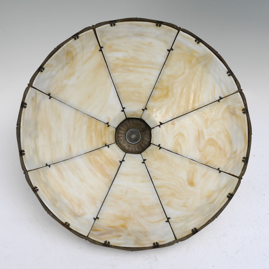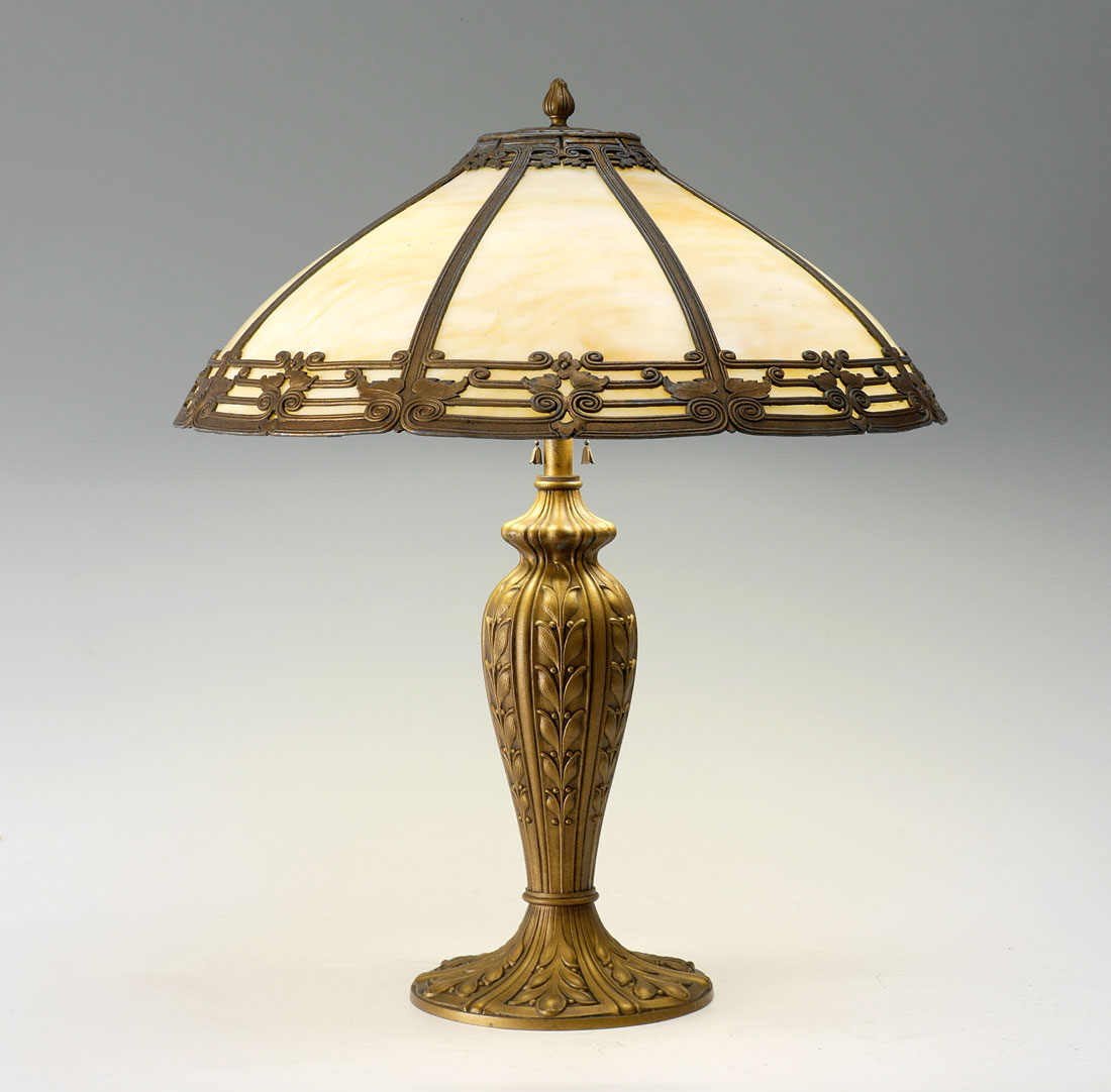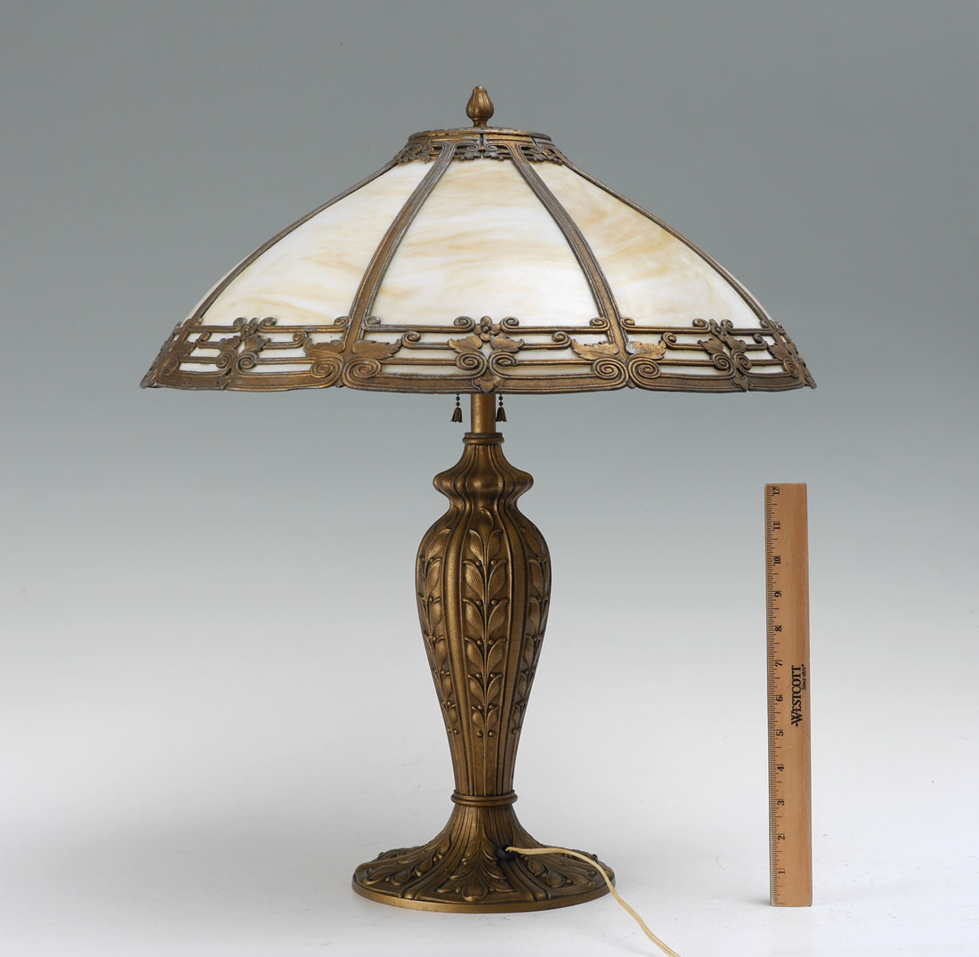 8 BENT PANEL CARAMEL SLAG GLASS LAMP: Gold decorated heavy cast iron base with foliate motif, double socket fixture, 24'' h. x 8'' dia. 8 panel shade with painted cast metal frame, 7 3/4'' h. x 20''.