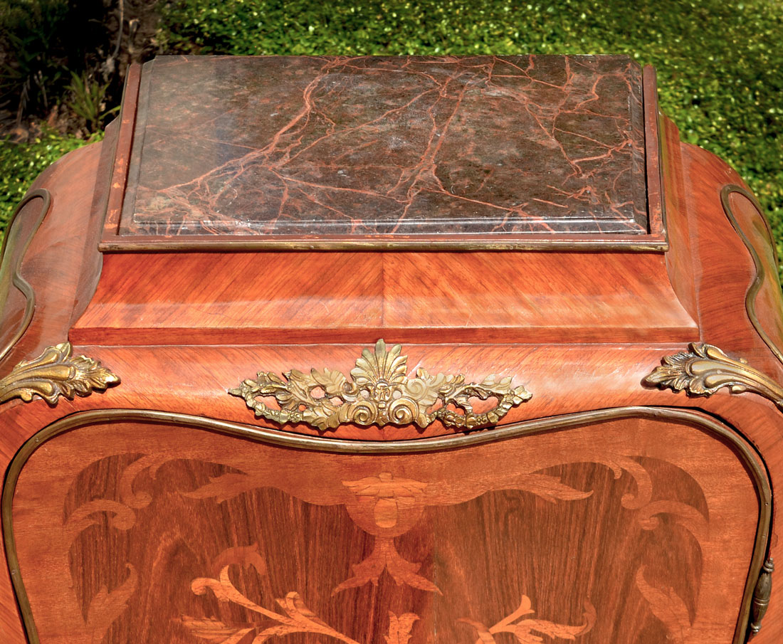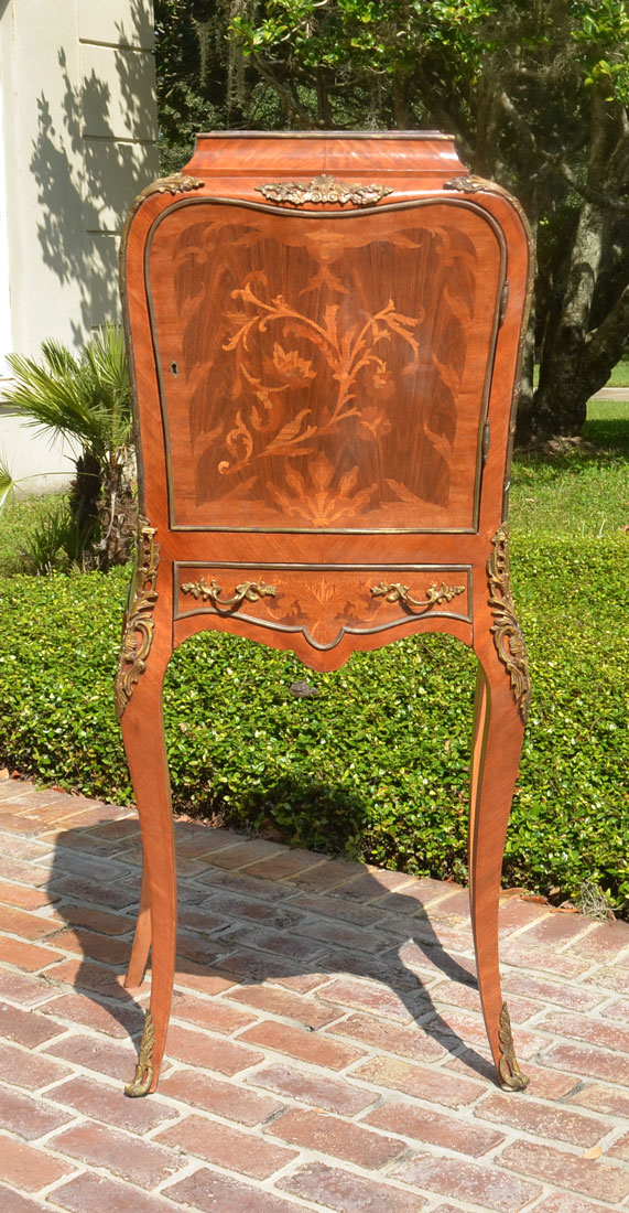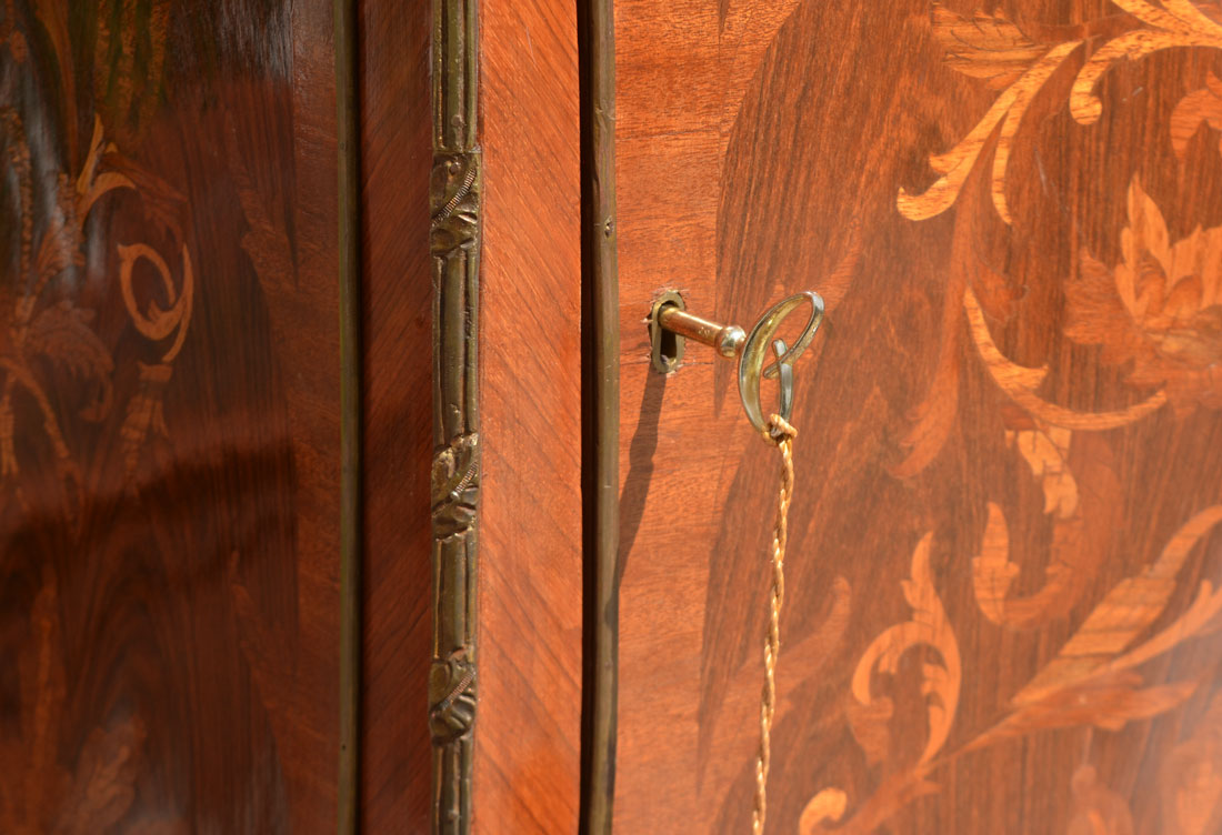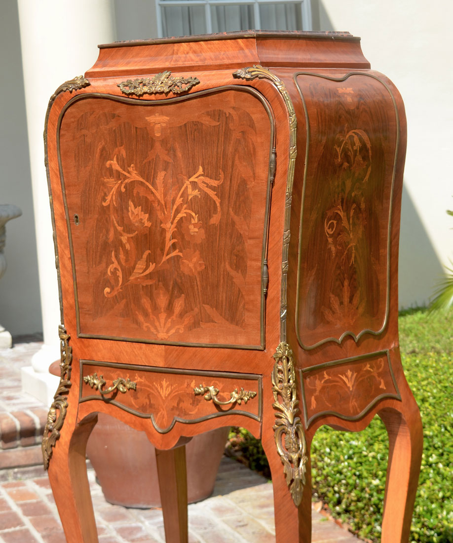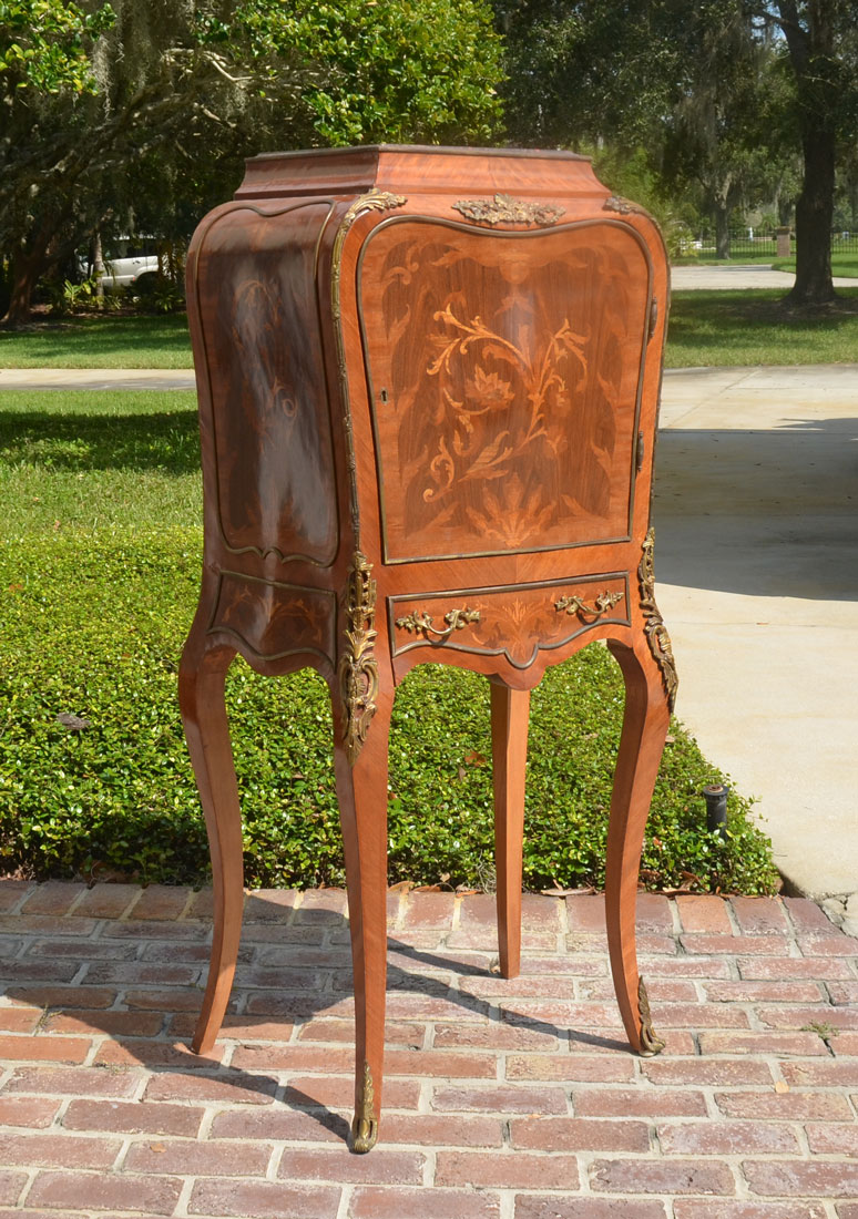 MARQUETRY INLAID BOMBE CABINET: Removable marble top, bombe swell cabinet with single door over single drawer, open interior, floral marquetry panels, cast metal accents and mounts. Shaped legs, overall 53 1/2'' h. x 24'' x 15 1/4''.