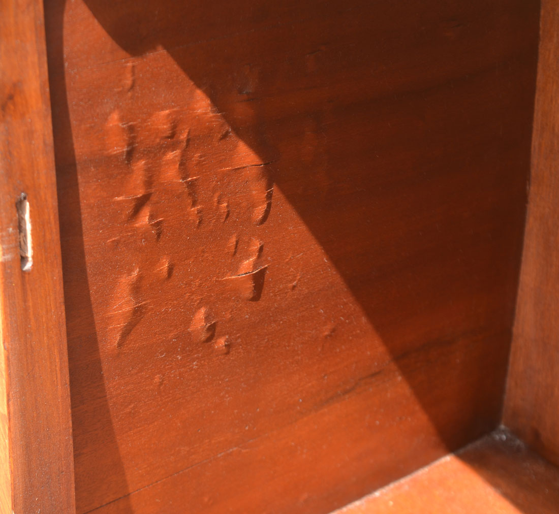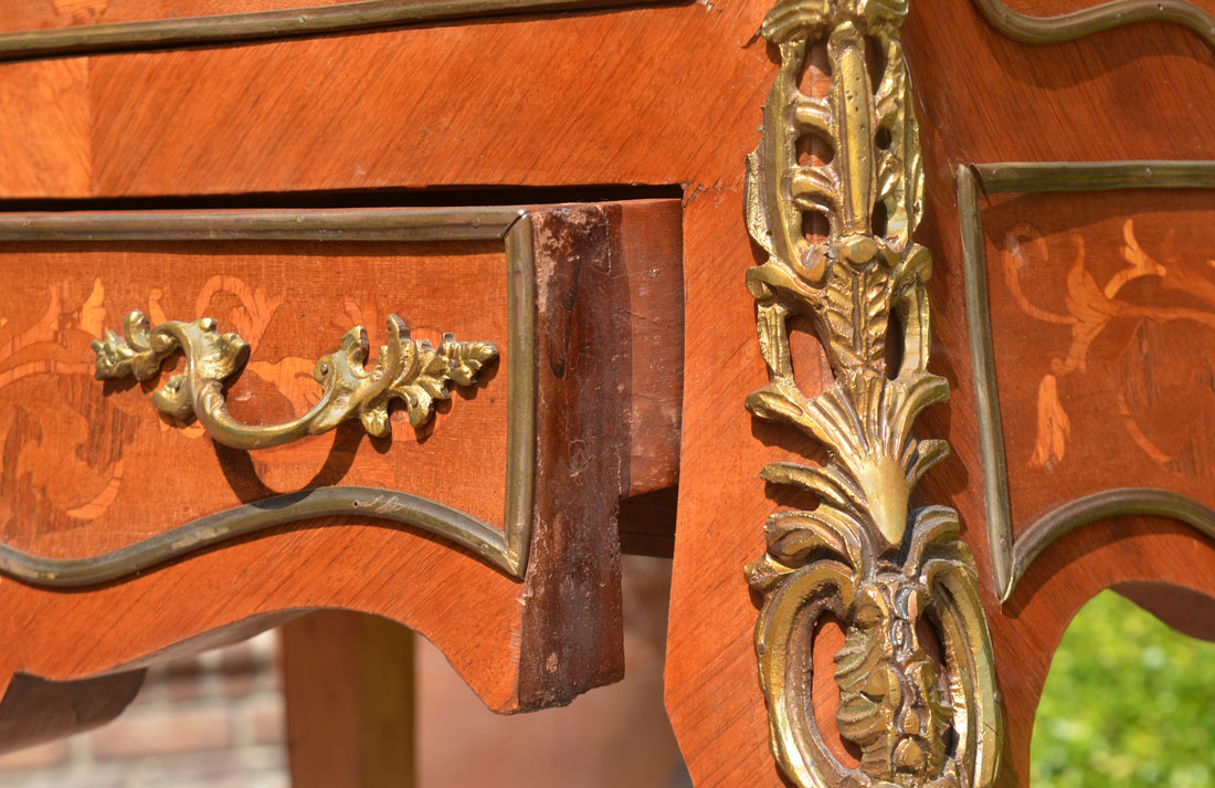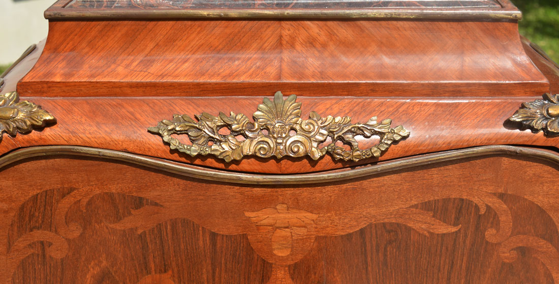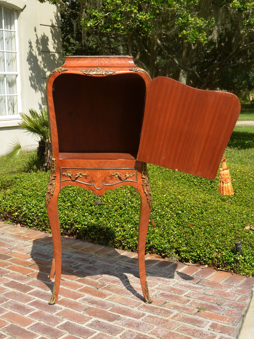 MARQUETRY INLAID BOMBE CABINET: Removable marble top, bombe swell cabinet with single door over single drawer, open interior, floral marquetry panels, cast metal accents and mounts. Shaped legs, overall 53 1/2'' h. x 24'' x 15 1/4''.